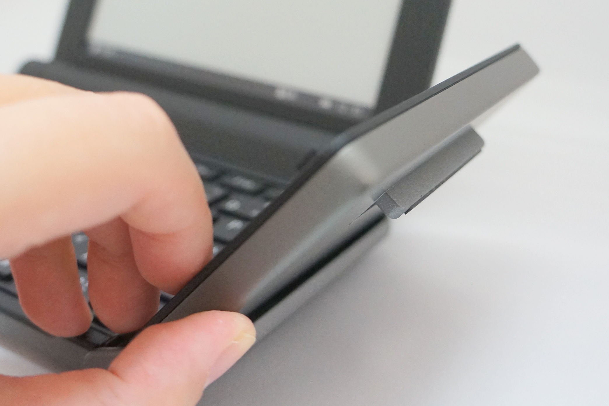 一方、今回の観音開きタイプは、コンパクトに収納できる、というメリットを持ちながら、開閉時にキーボードに収納されているキーフットが自動的に出てくるため、タイピング時もキーボードを安定させられるのです。