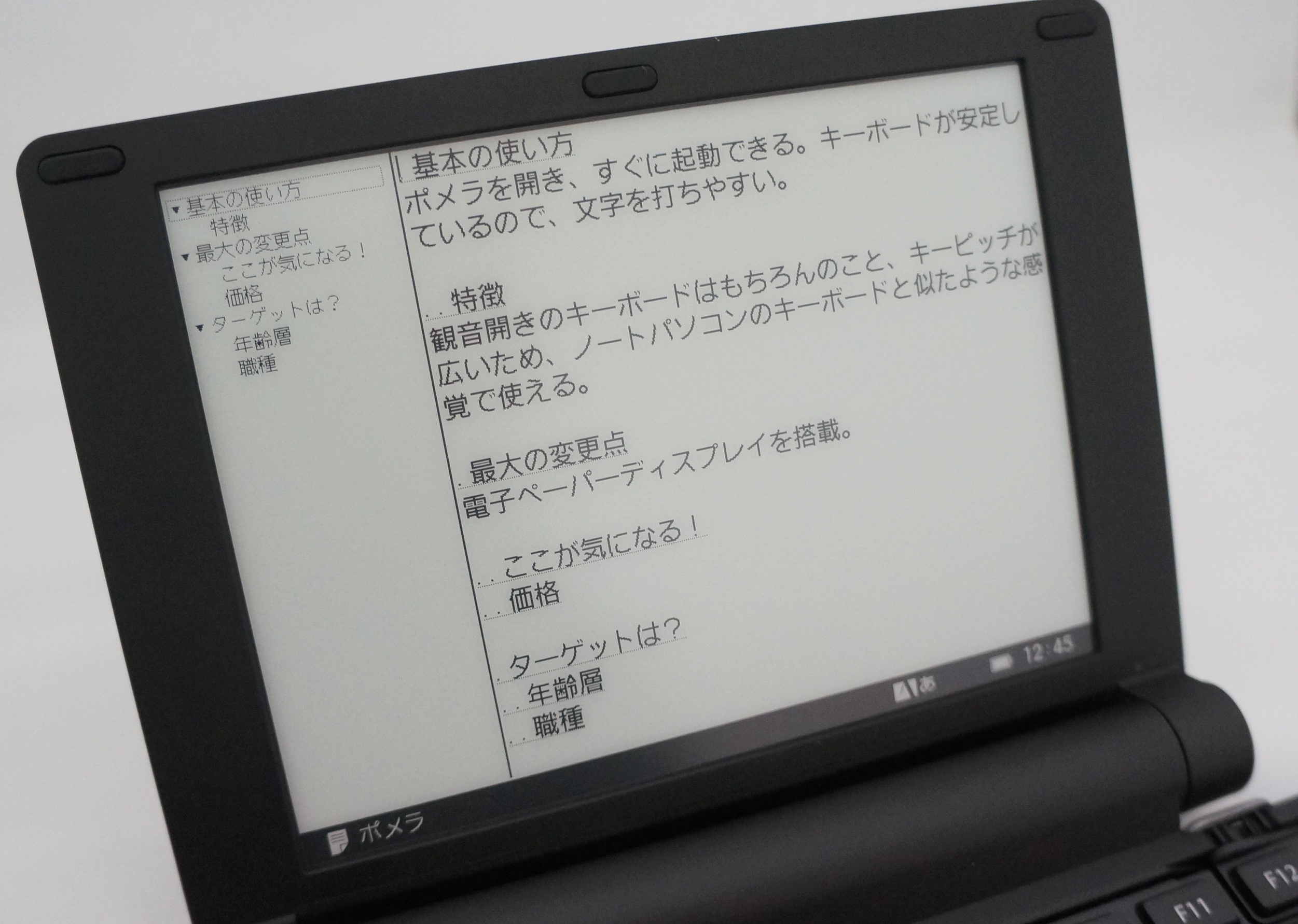 ポメラというと、“メモ用”の印象が強く、ポメラからそのまま資料を作成するイメージは抱きにくいかもしれません。しかし、アウトライン機能に見られるように、ポメラそのものを資料作成の“本番用”として利用することも可能なのです。ポメラ向けの日本語入力システム「ATOK for pomera」を搭載しているため、漢字変換もスムーズに行えます。