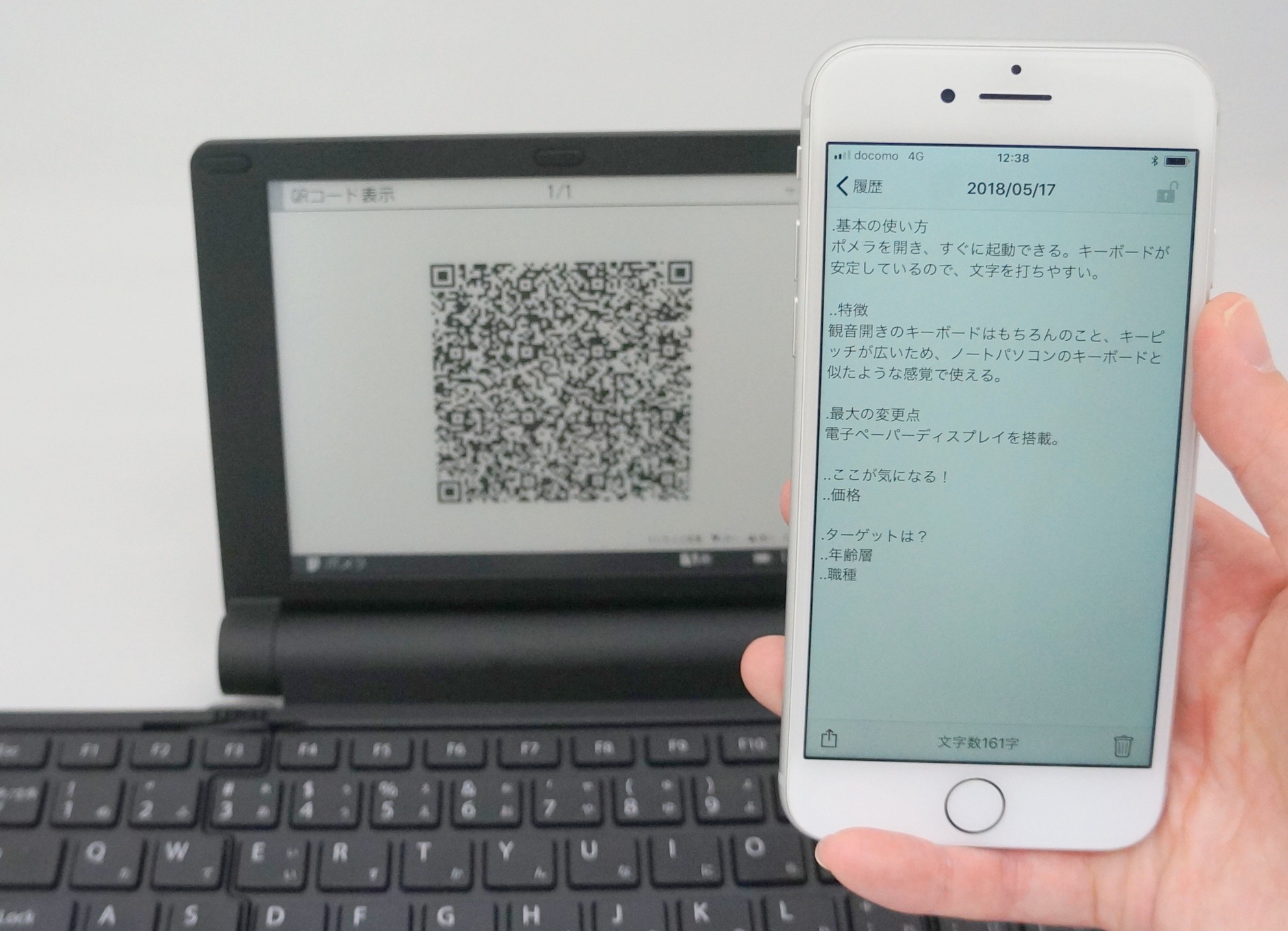 なお、作成したメモはmicro SDカードやSDカードを使って直接パソコンに送れます。作成したファイルをQRコードに変換し、専用アプリで読み取ればファイルをスマホに移動することもできます。