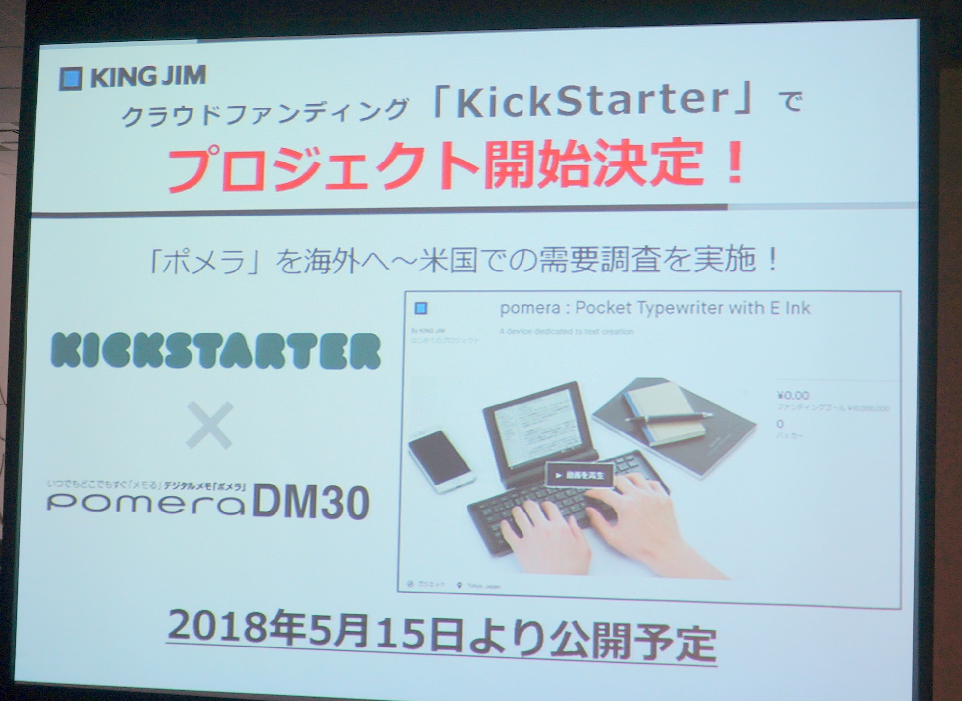キングジムは今回、クラウドファンディング、KickStarterでプロジェクトを開始し、「DM30」のアメリカ向け需要調査を実施することを発表しました。KickStarterでは、従来製品と同じ日本語配列のキーボードを提供する予定で、すでに5月15日から公開が開始されています。