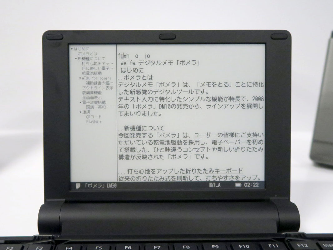 「DM30」ふたつ目の特徴は、E Ink社の電子ペーパーディスプレイを搭載した点。タイピングした文字が、紙に印刷されたようにくっきり表示されるのが特長です。