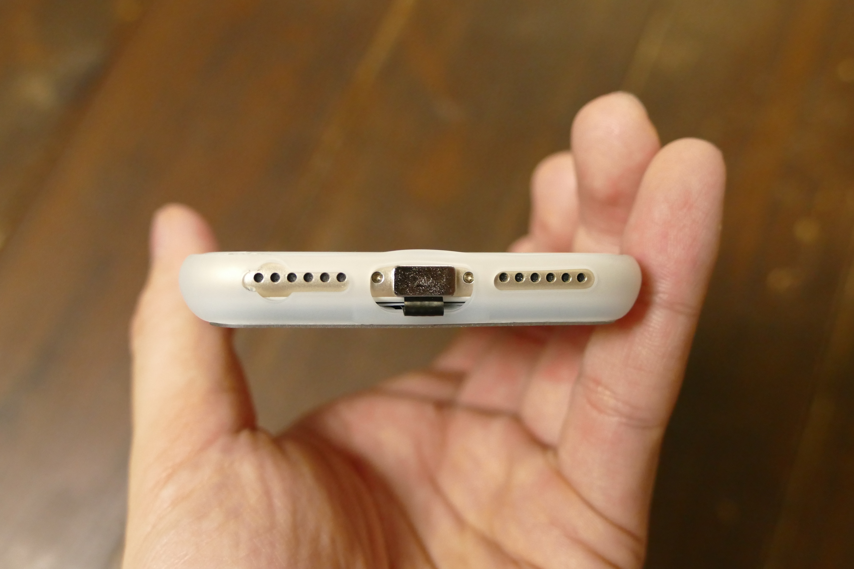 ケースの背面には、出力について記載がありました。下部にLightningコネクタの端子がちょろんっと飛び出ています。