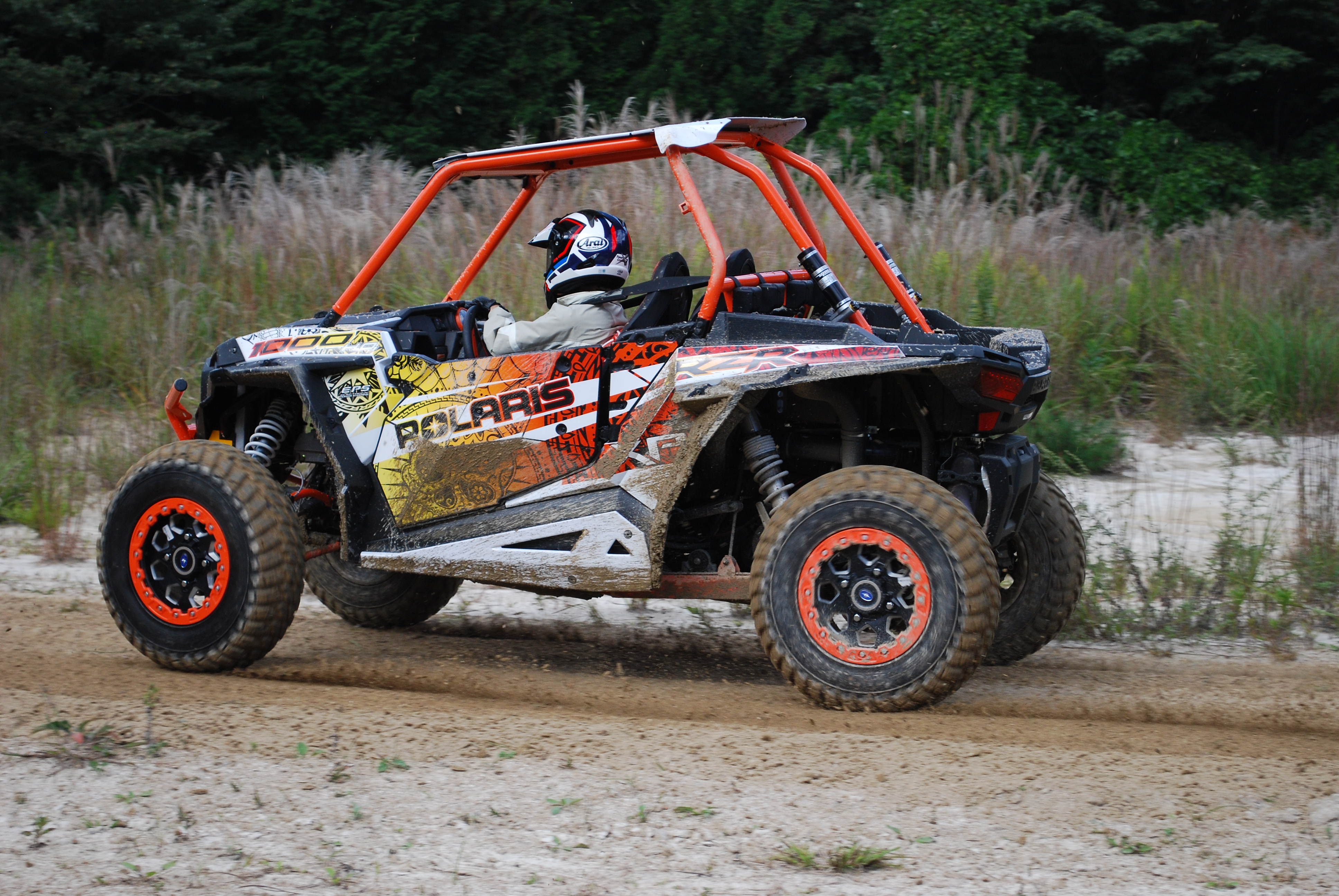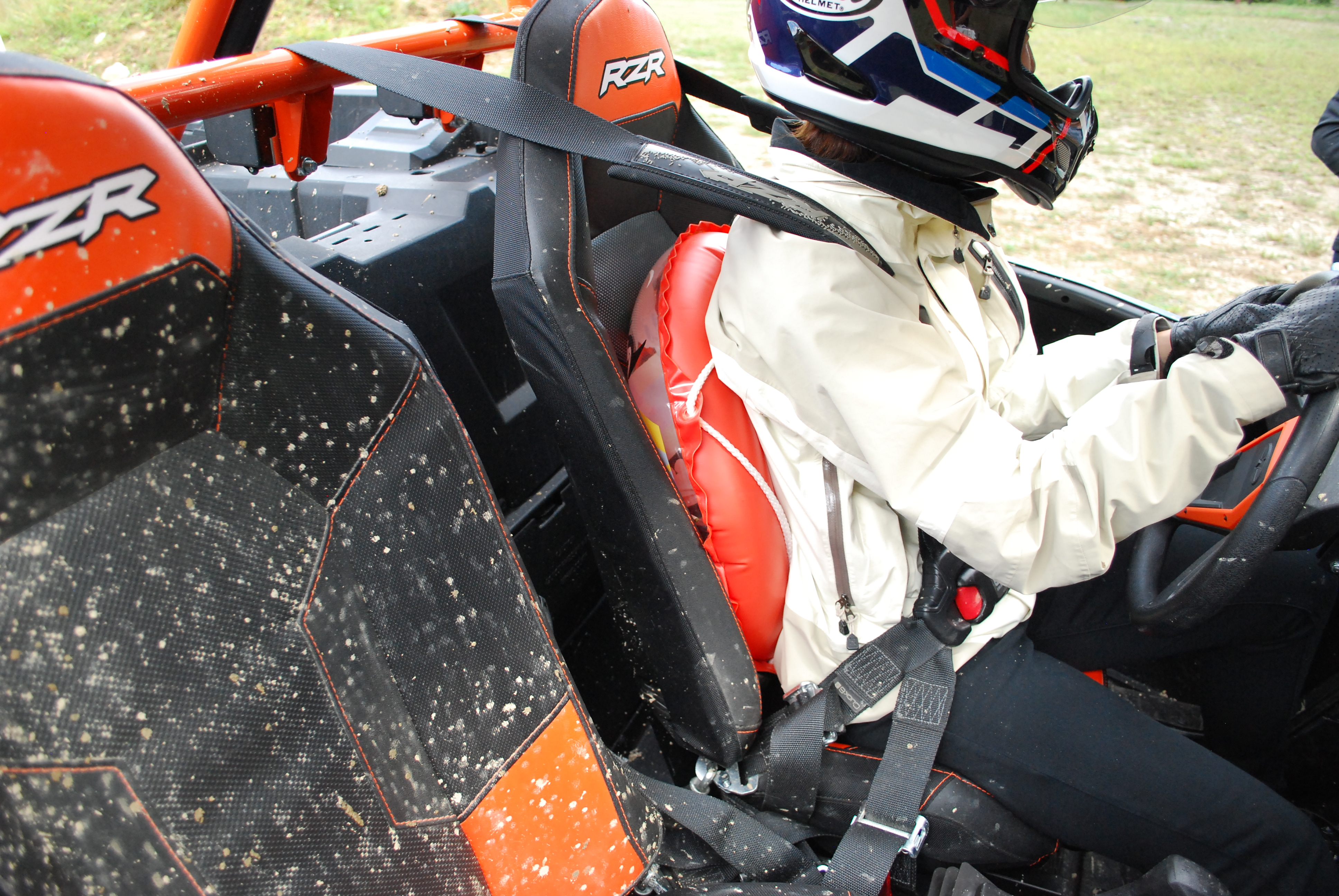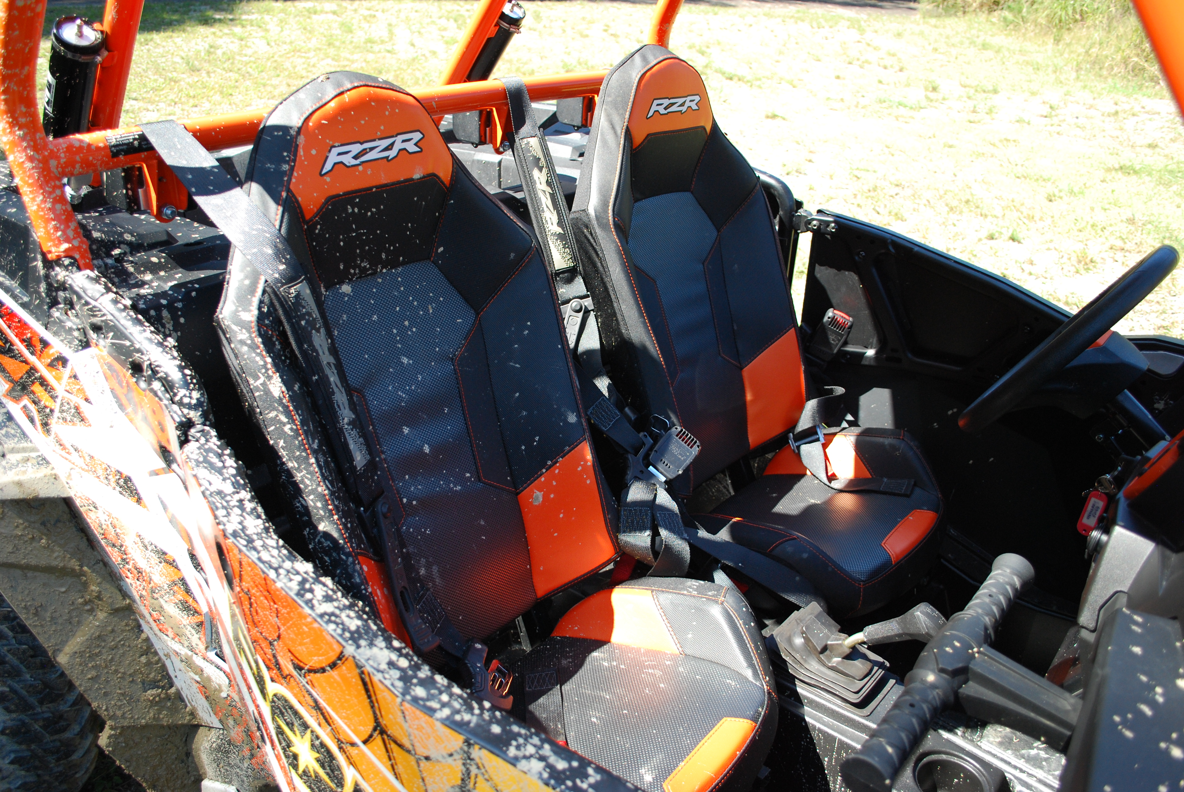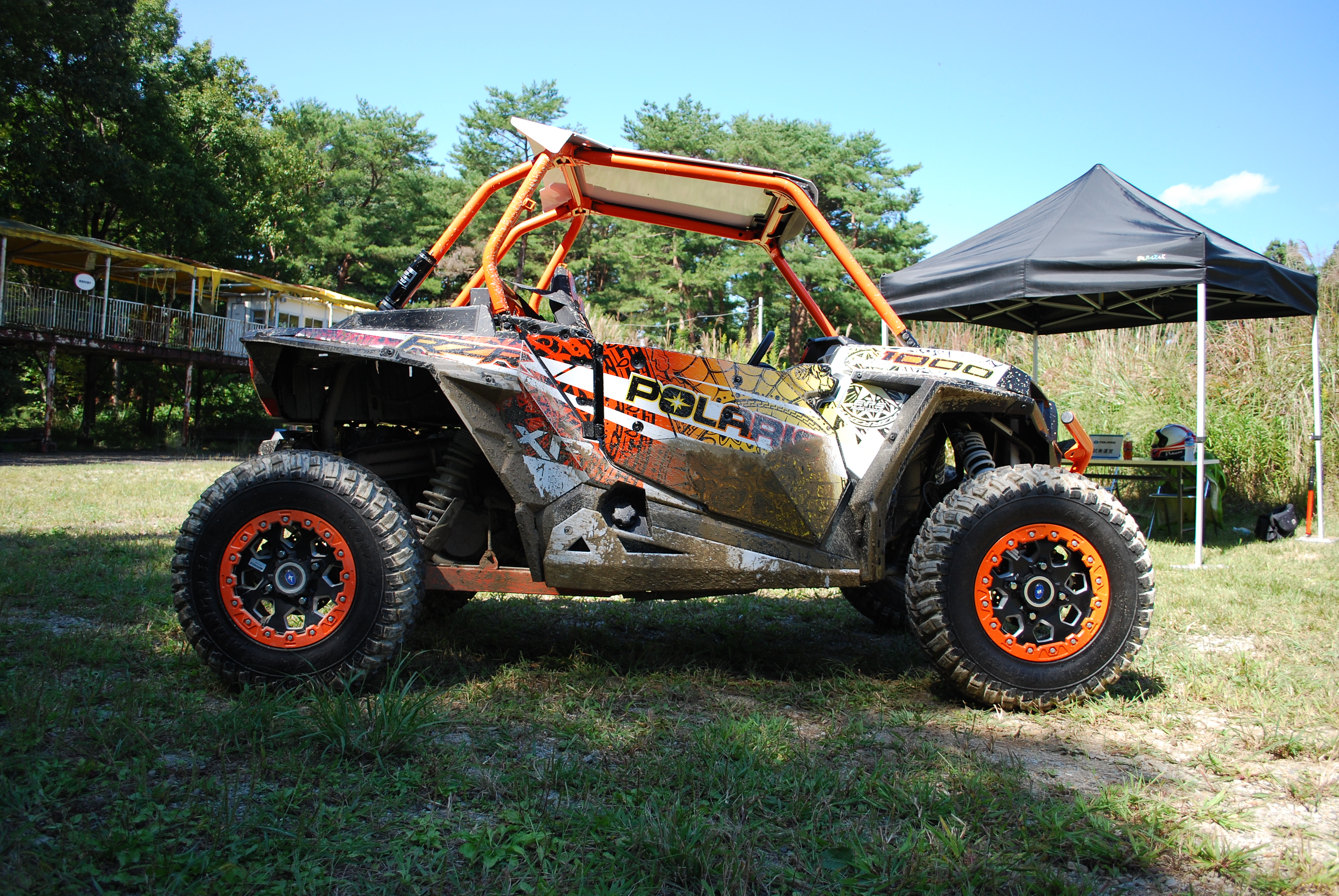 ポラリス社のORVはすべて窓のない完全オープンエア(標準)。このRZRシリーズに至っては、エンジンやタイヤなどの主要パーツに強固なフレームが乗っていて、申し訳程度にボンネットやドアが付いている……そう理解していただいて良いかと思います。レンジャーとかサバゲーとかそういう物騒な単語が脳裏に浮かんで消えていきます。