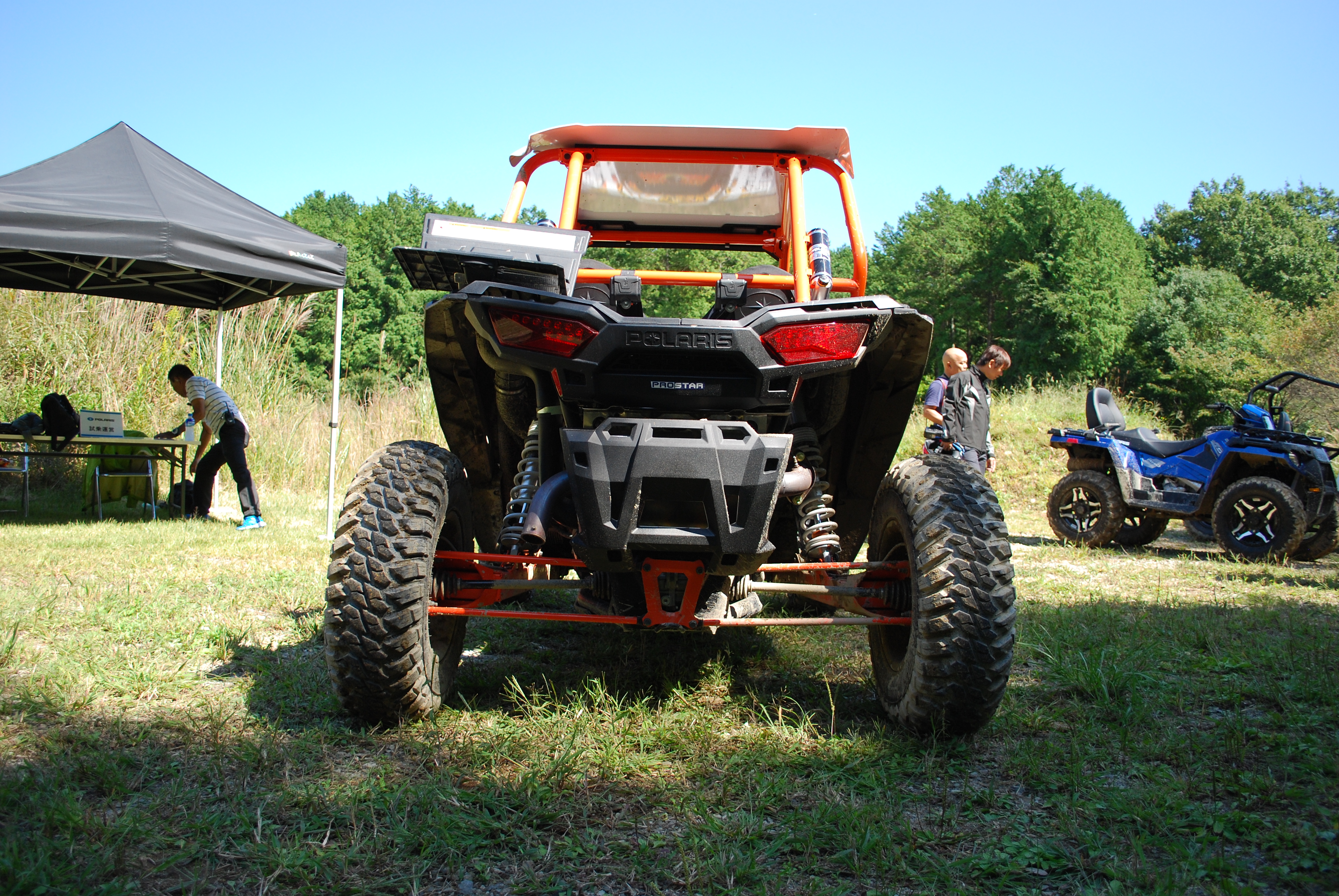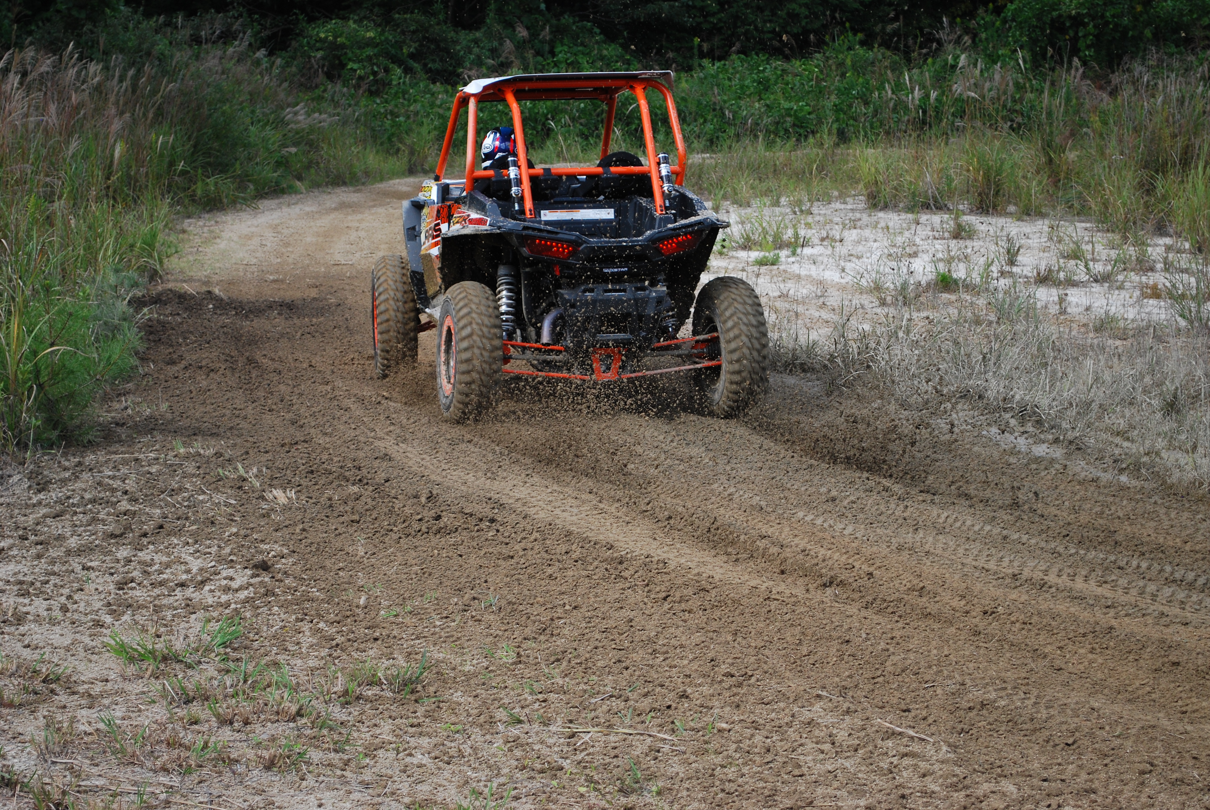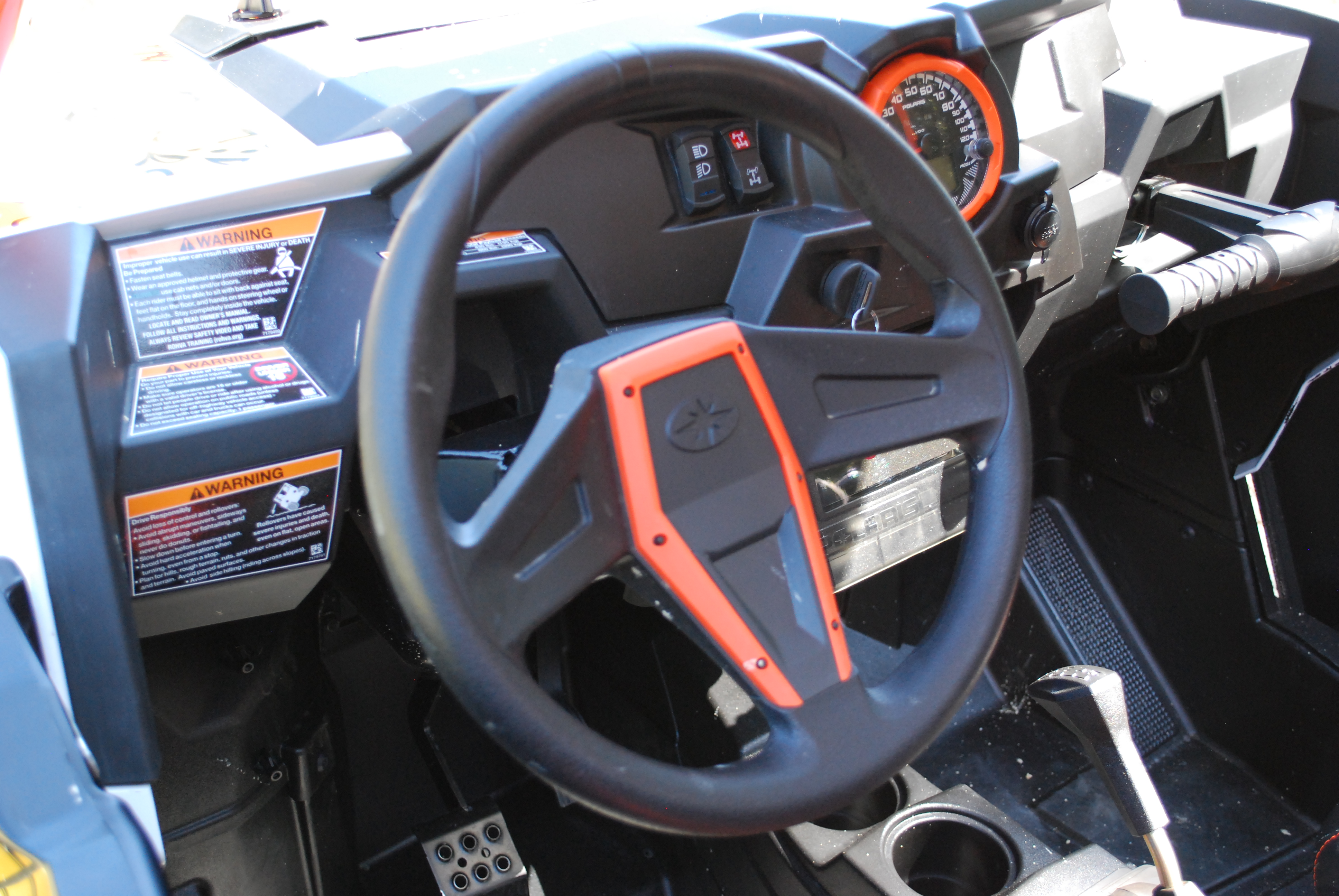 ポラリス社のORVはすべて窓のない完全オープンエア(標準)。このRZRシリーズに至っては、エンジンやタイヤなどの主要パーツに強固なフレームが乗っていて、申し訳程度にボンネットやドアが付いている……そう理解していただいて良いかと思います。レンジャーとかサバゲーとかそういう物騒な単語が脳裏に浮かんで消えていきます。