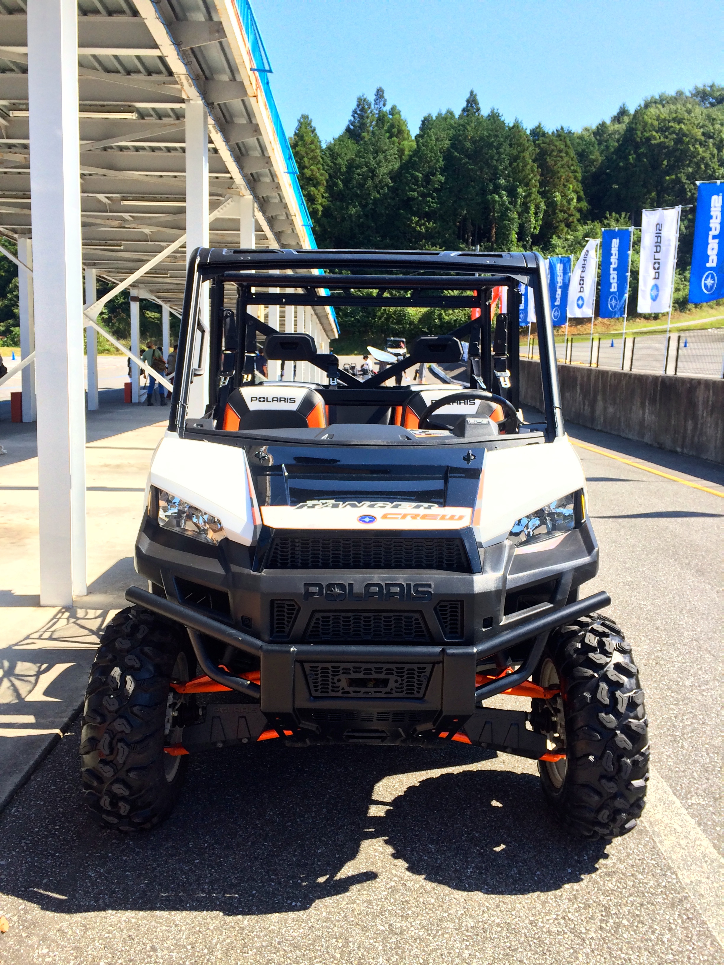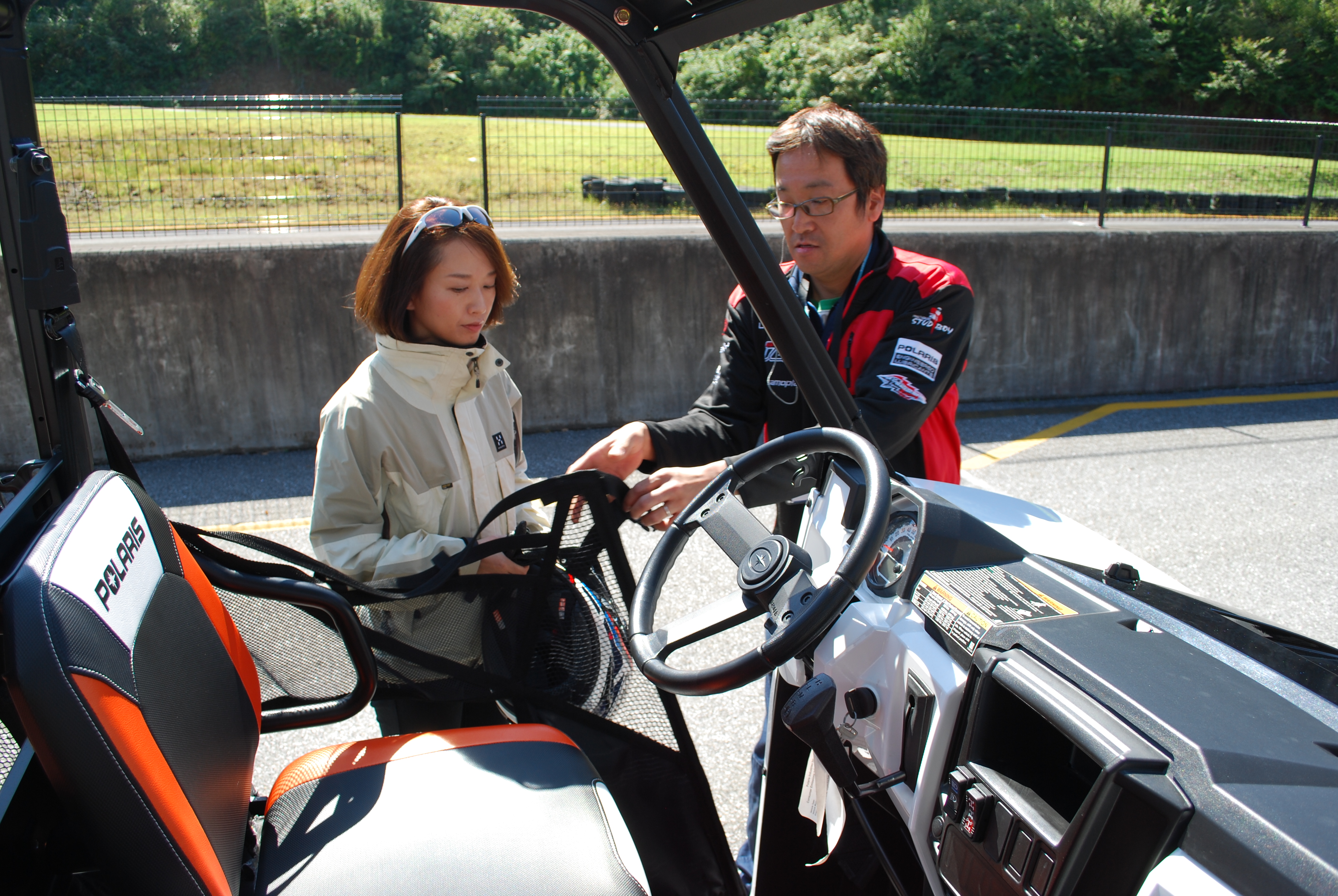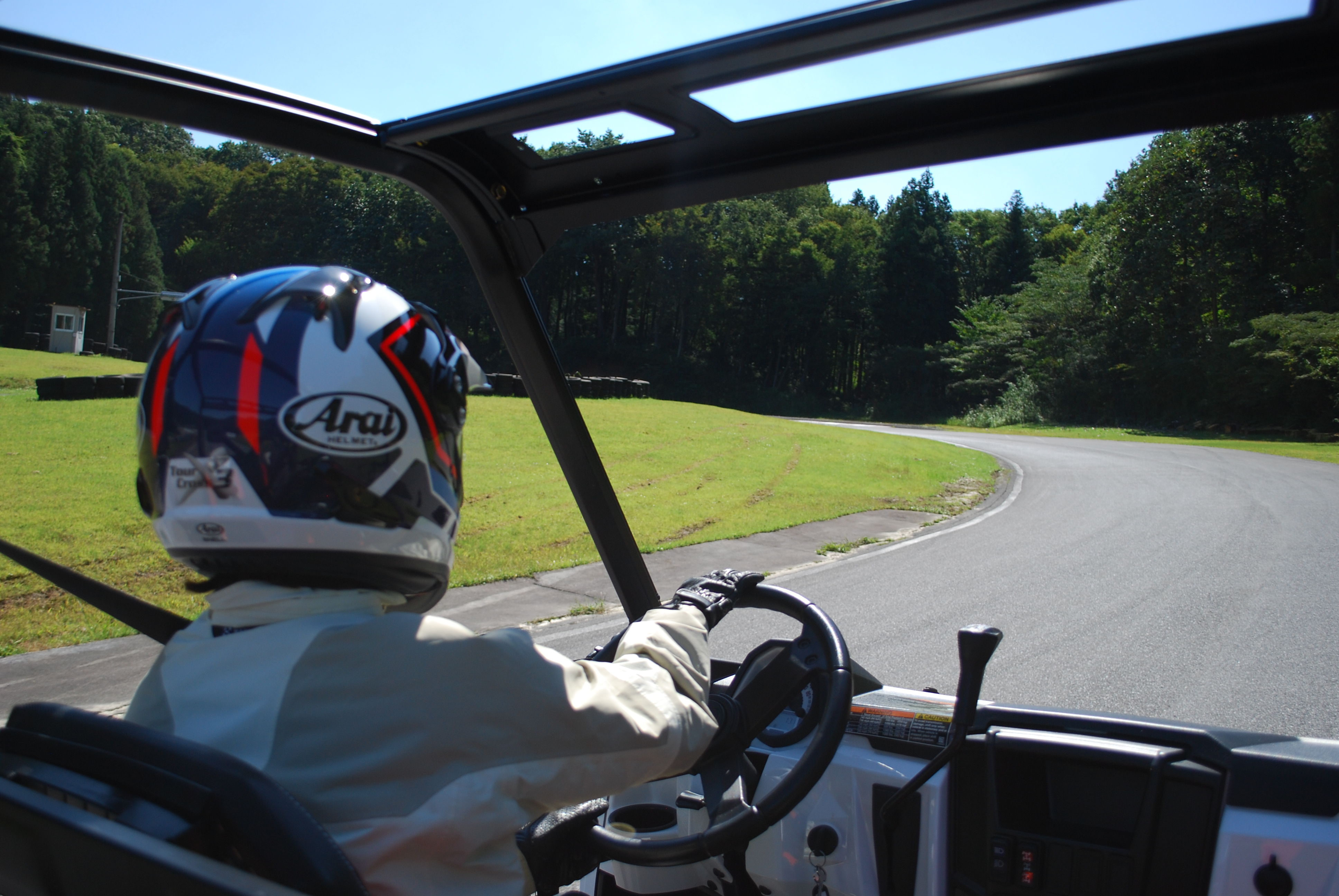 試乗2台目は「RANGER CREW 900 EPS」。災害救助対応に最適なRANGERシリーズは官公庁などからも注目されていて、今年の6月には、2人乗りの「XP 900」が大型特殊自動車としてナンバーを取得しているそうです。さて、私が試乗する「CREW 900 EPS」は5人乗りの大型タイプ。先に試乗した「RZR」よりは、取っ付きやすい雰囲気です。しかも、試乗場所はオフロードコースではなくサーキット! 果たしてどんな走行体験になるんでしょう?