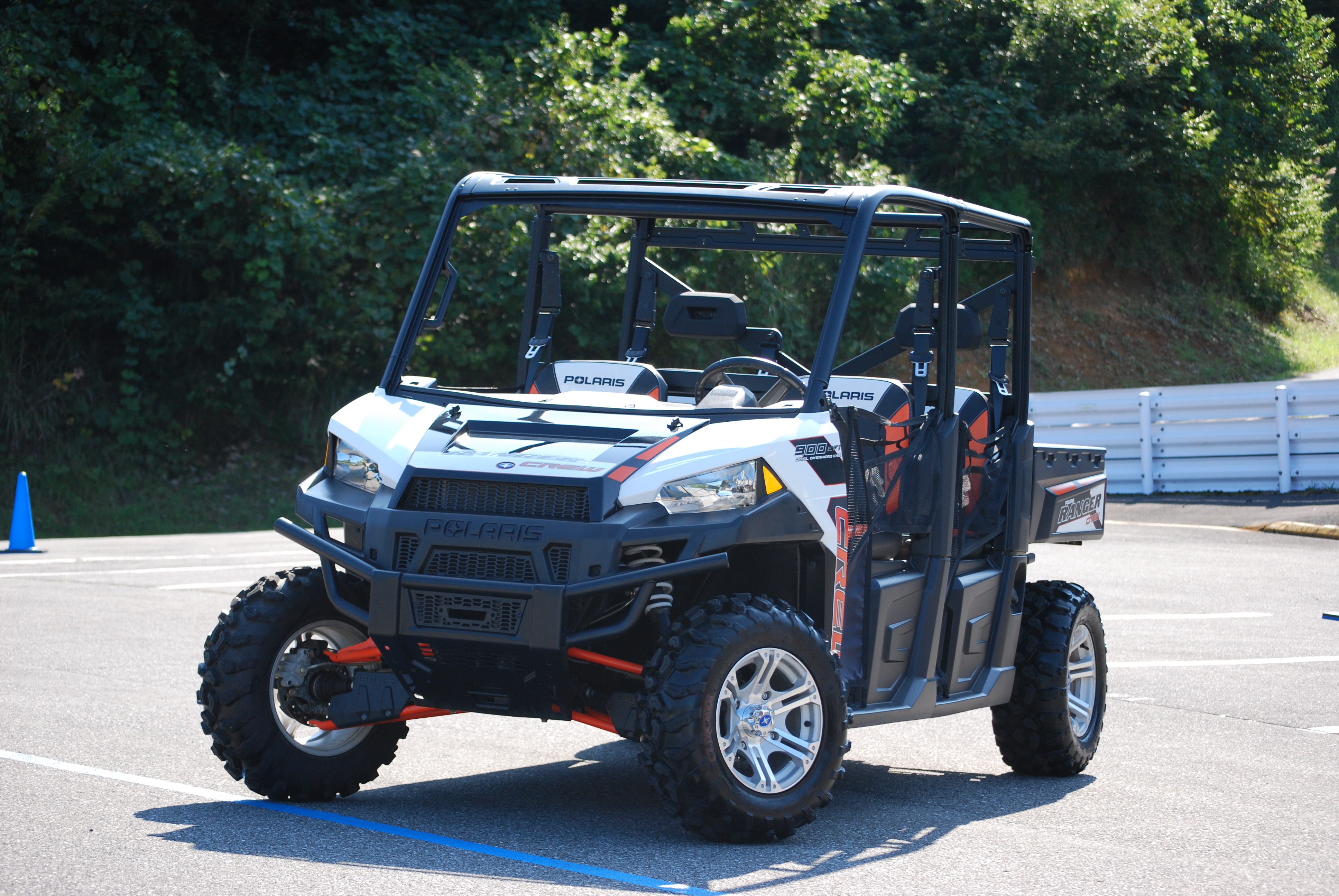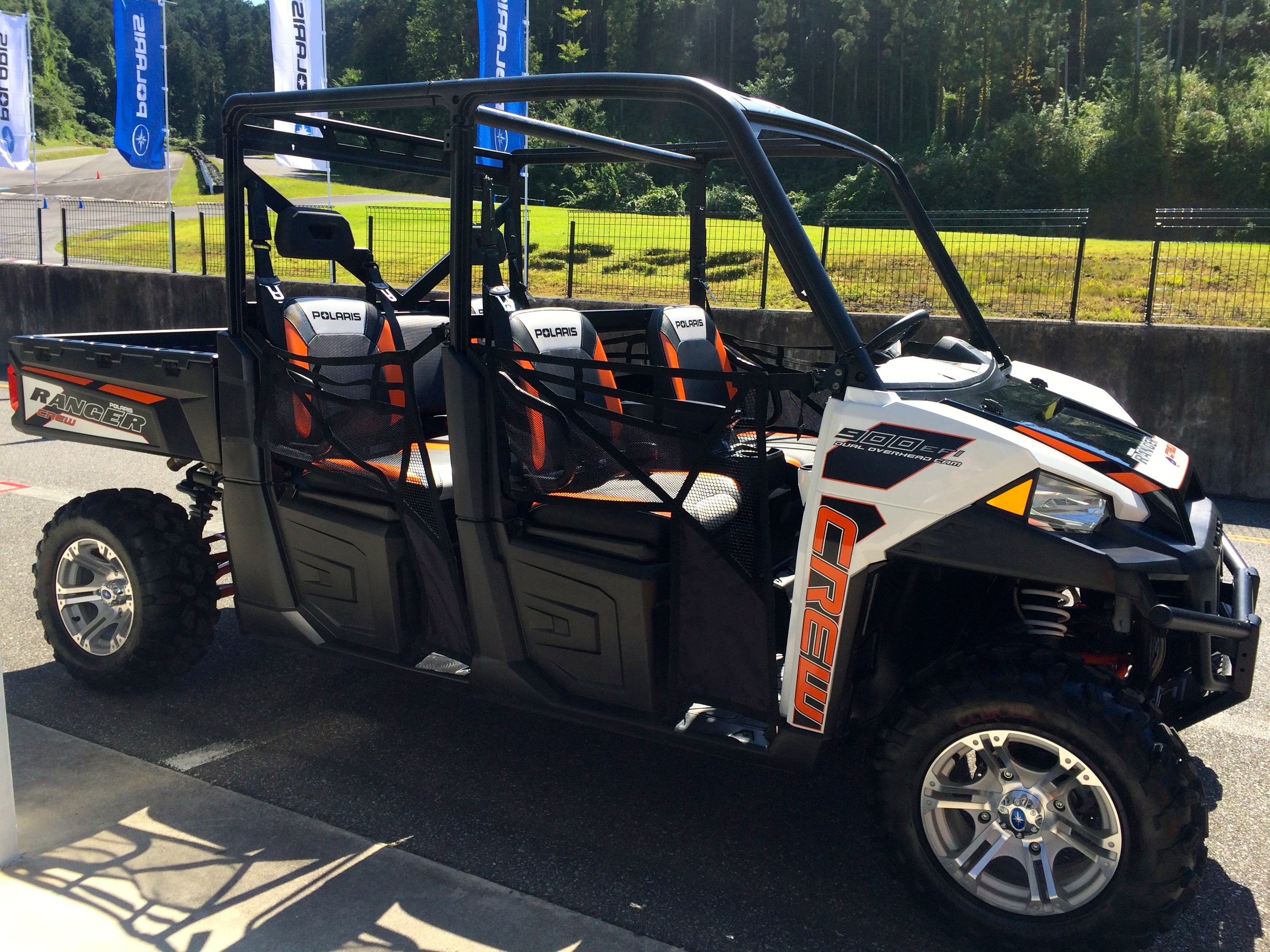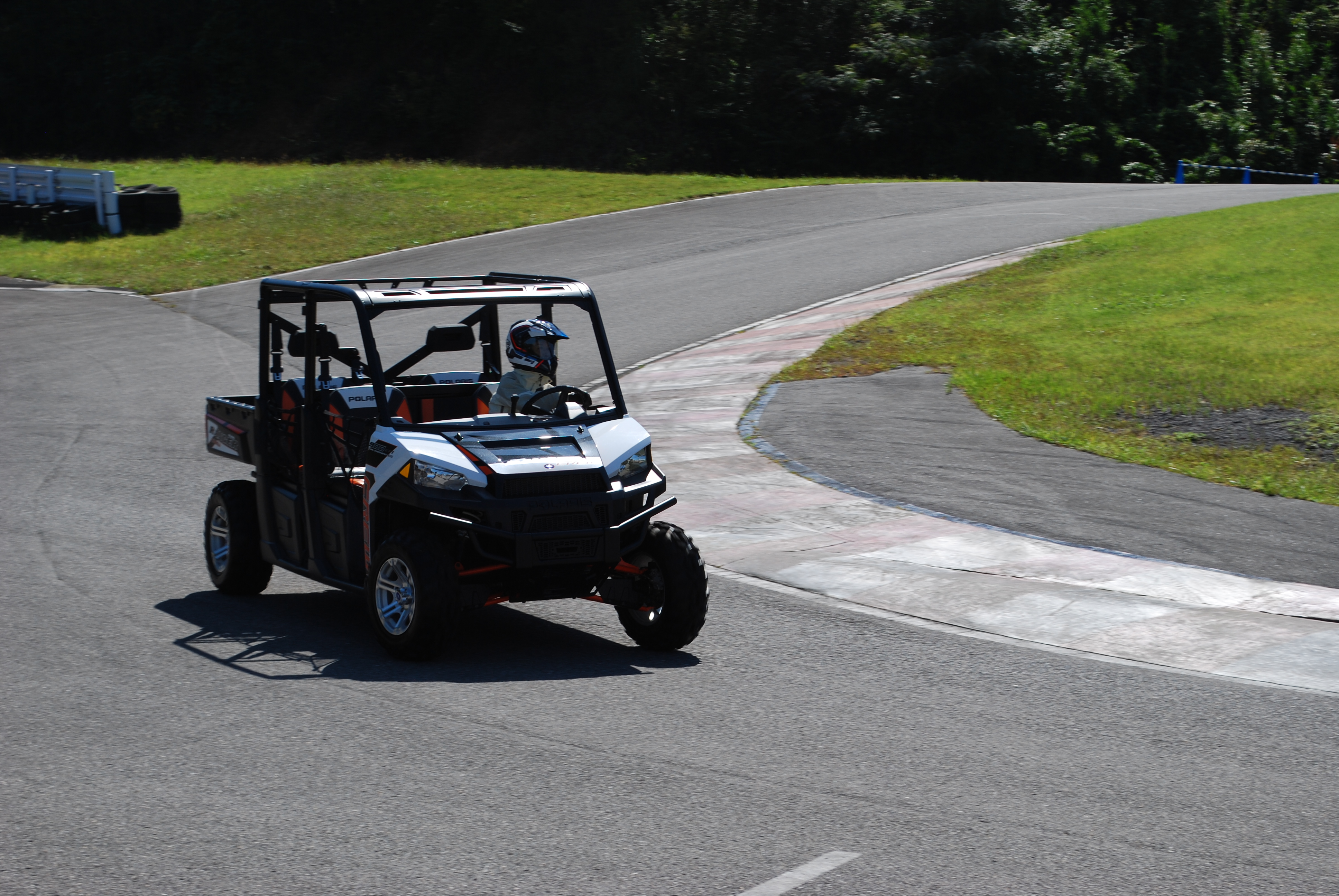 試乗2台目は「RANGER CREW 900 EPS」。災害救助対応に最適なRANGERシリーズは官公庁などからも注目されていて、今年の6月には、2人乗りの「XP 900」が大型特殊自動車としてナンバーを取得しているそうです。さて、私が試乗する「CREW 900 EPS」は5人乗りの大型タイプ。先に試乗した「RZR」よりは、取っ付きやすい雰囲気です。しかも、試乗場所はオフロードコースではなくサーキット! 果たしてどんな走行体験になるんでしょう?