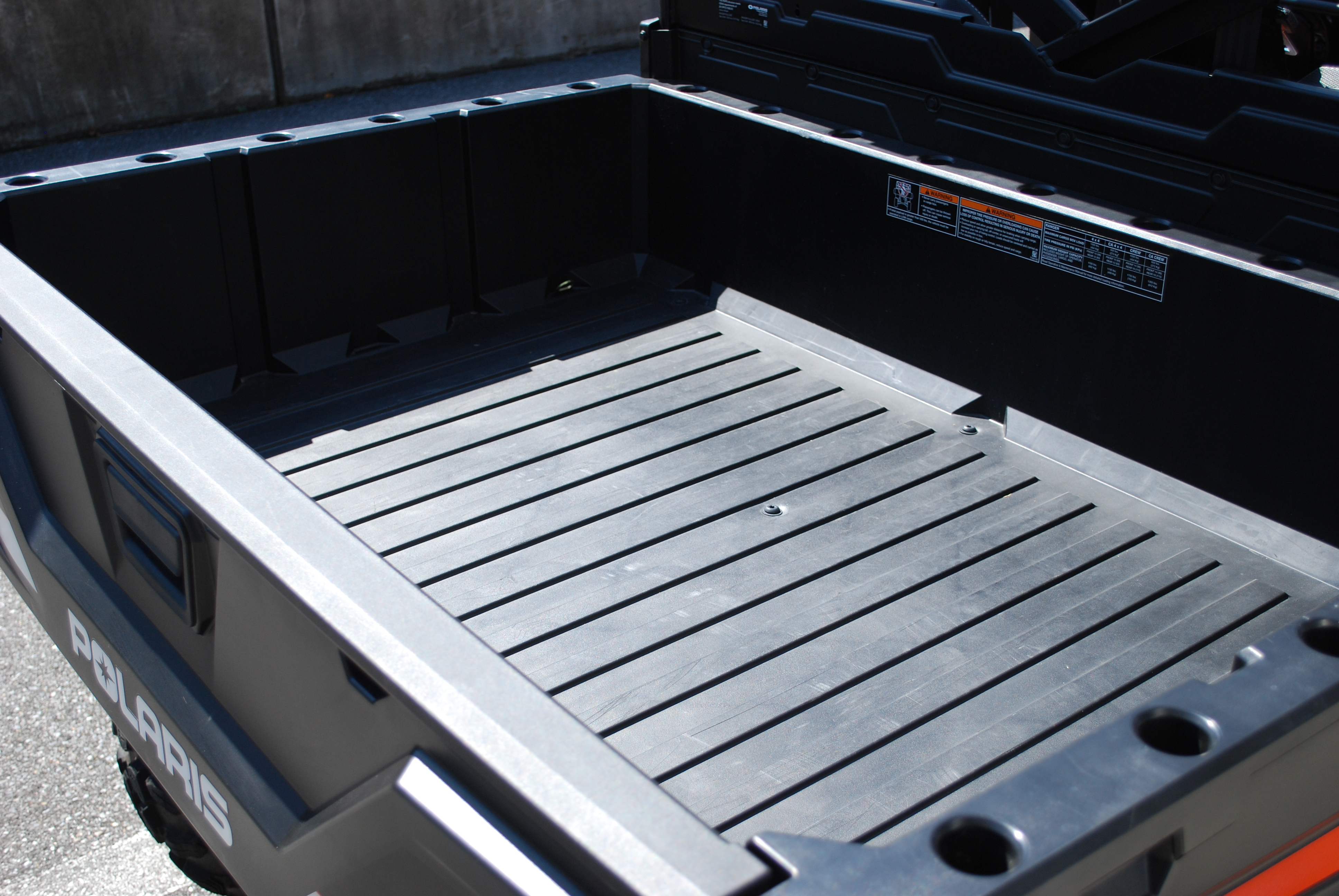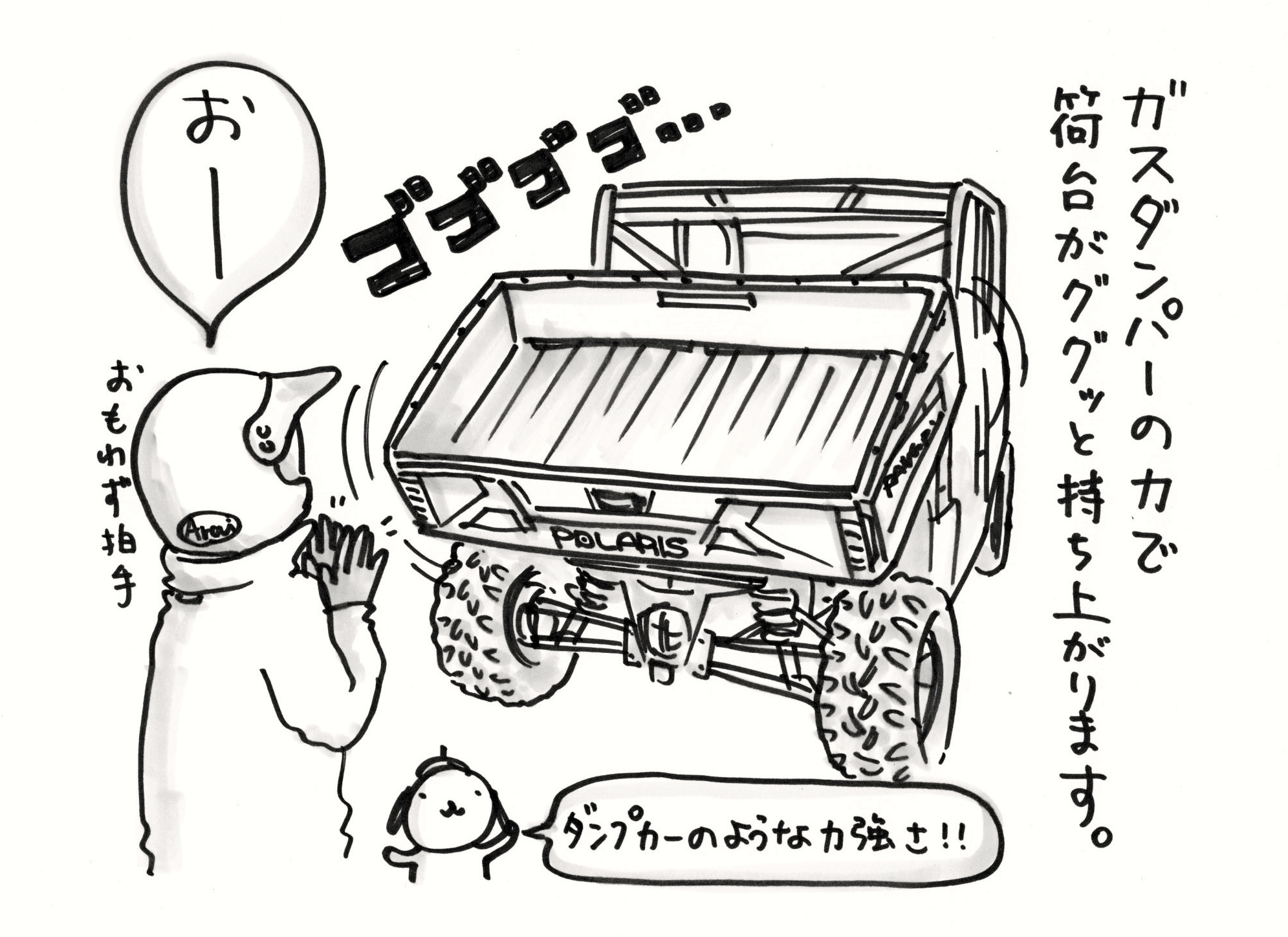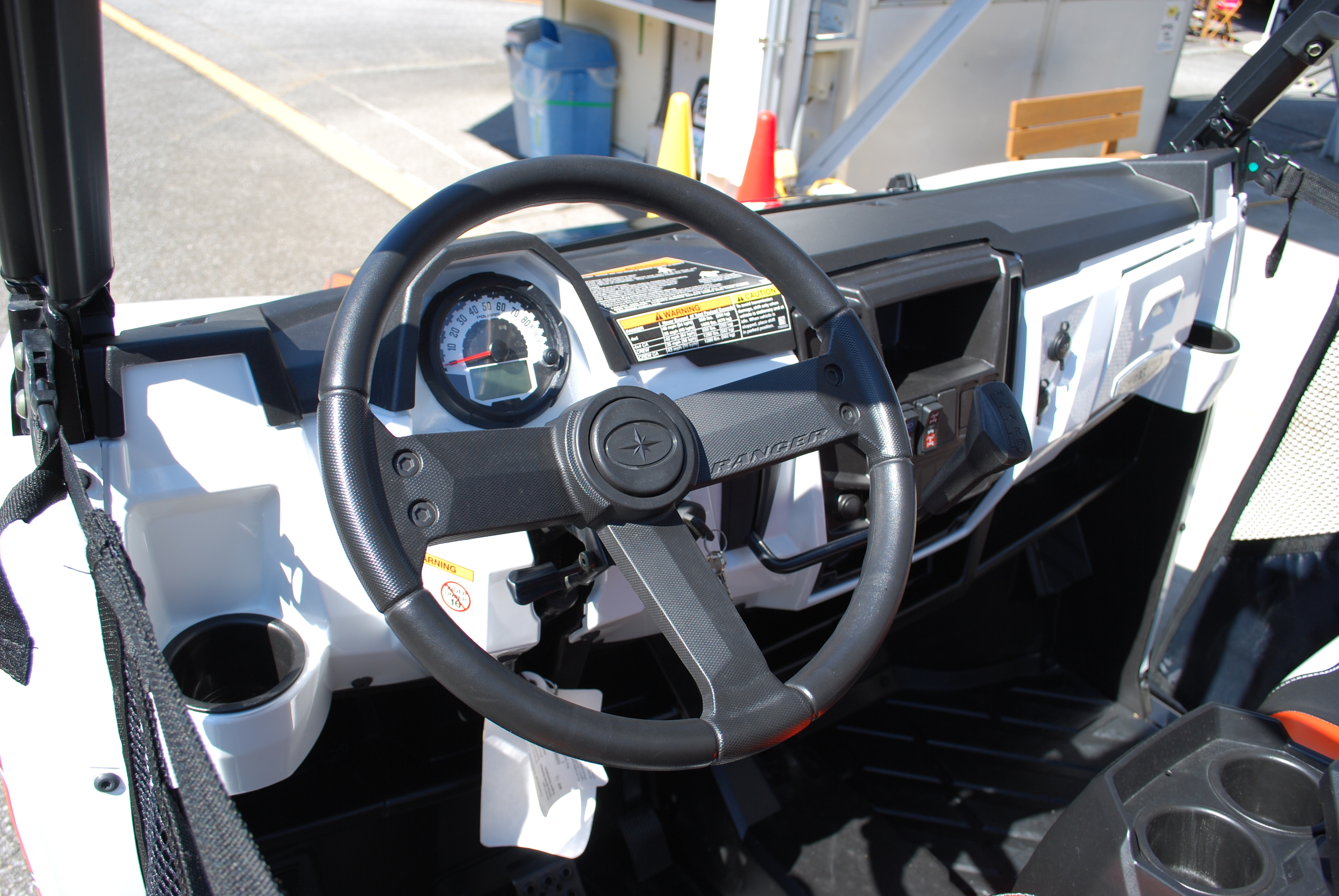 ミッションは最初に試乗した「RZR」同様、ポラリスCVT。シフトレバーが少々渋い気がしましたが、それは単に私に力がないだけで、屈強なアウトドア野郎が操作するには全く問題ないかと思われます。また、ダッシュボードの真ん中にあるスイッチ操作で、二駆モードと四駆モードのセレクトが可能。その他、速度メーターは「km/h」表示(マイル表示だと焦る)、ドリンクホルダーやグローブボックスなども装備されているので、わりと普通のクルマのような感覚で乗れそうです。