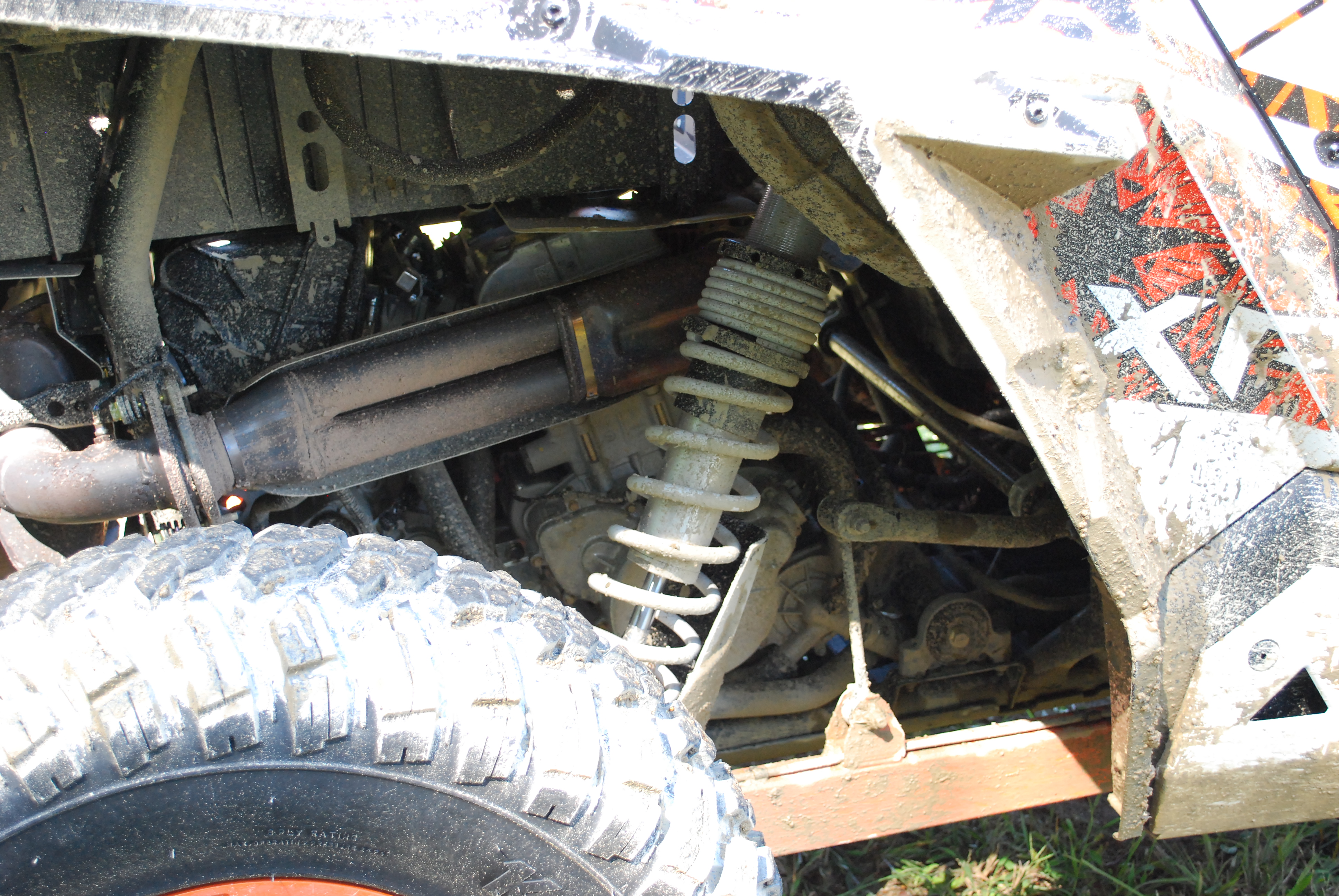 試乗1台目は「RZR」シリーズの特別仕様車「XP 1000 CALAVERA EDITION」。何が特別仕様なのかというと、まず外装のグラフィック。やたら強そうですね(ケンカとか)。他にサスペンションアームやブラックアルミホイールなど、イケイケ感がハンパありません。フロントのサスペンションとか見ると狂気すら感じますが、仲良く2人乗り仕様です。