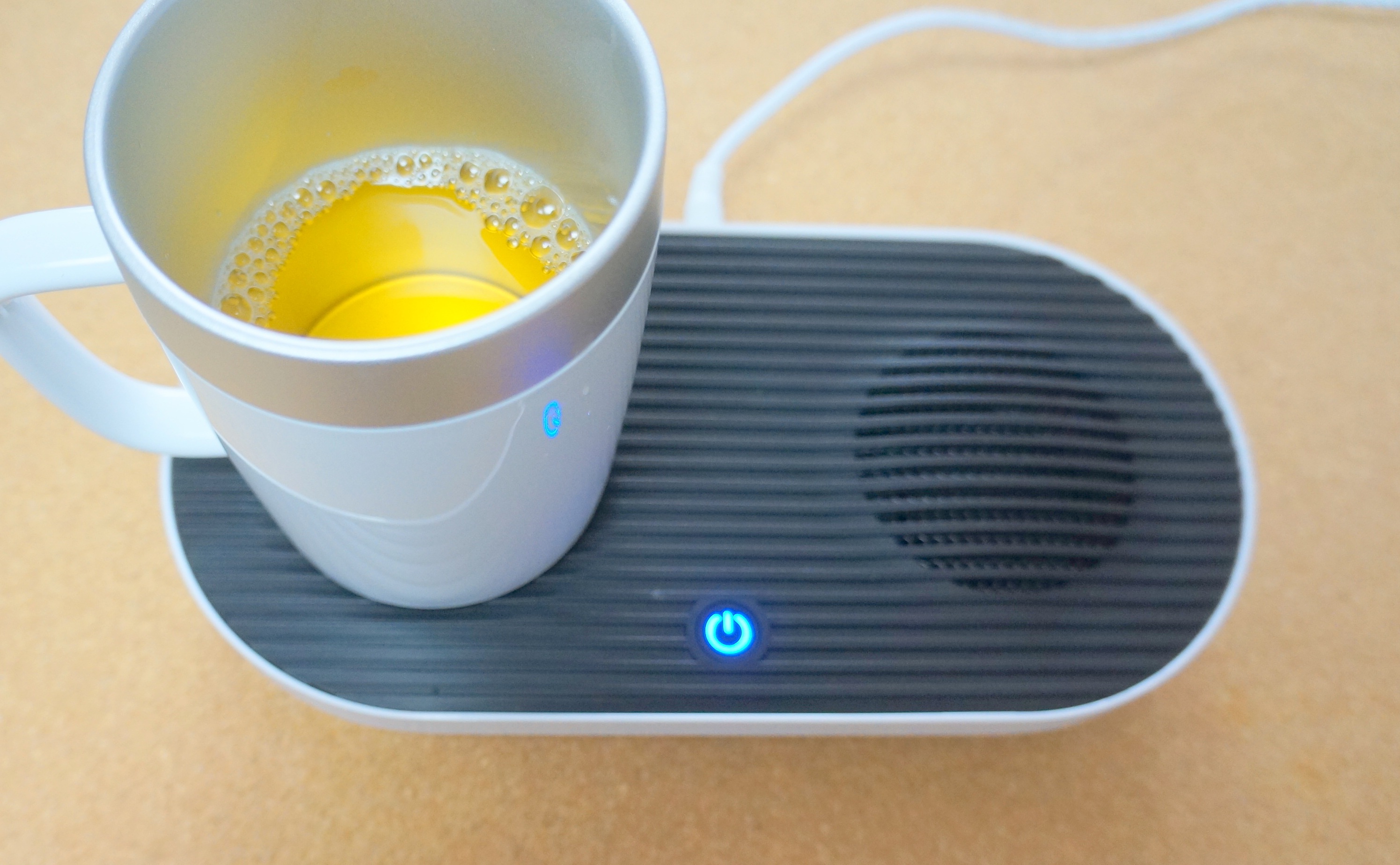 「デスクトップ冷熱カップ」は、飲み物を入れるアルミ合金の専用カップと、飲み物の温度をキープするプレートがセットになった製品です。使い方は、プレートにカップを置いてスイッチを入れるだけ。本体上の丸い円に入る容器なら、缶飲料や錫製のタンブラーでも使用できます。