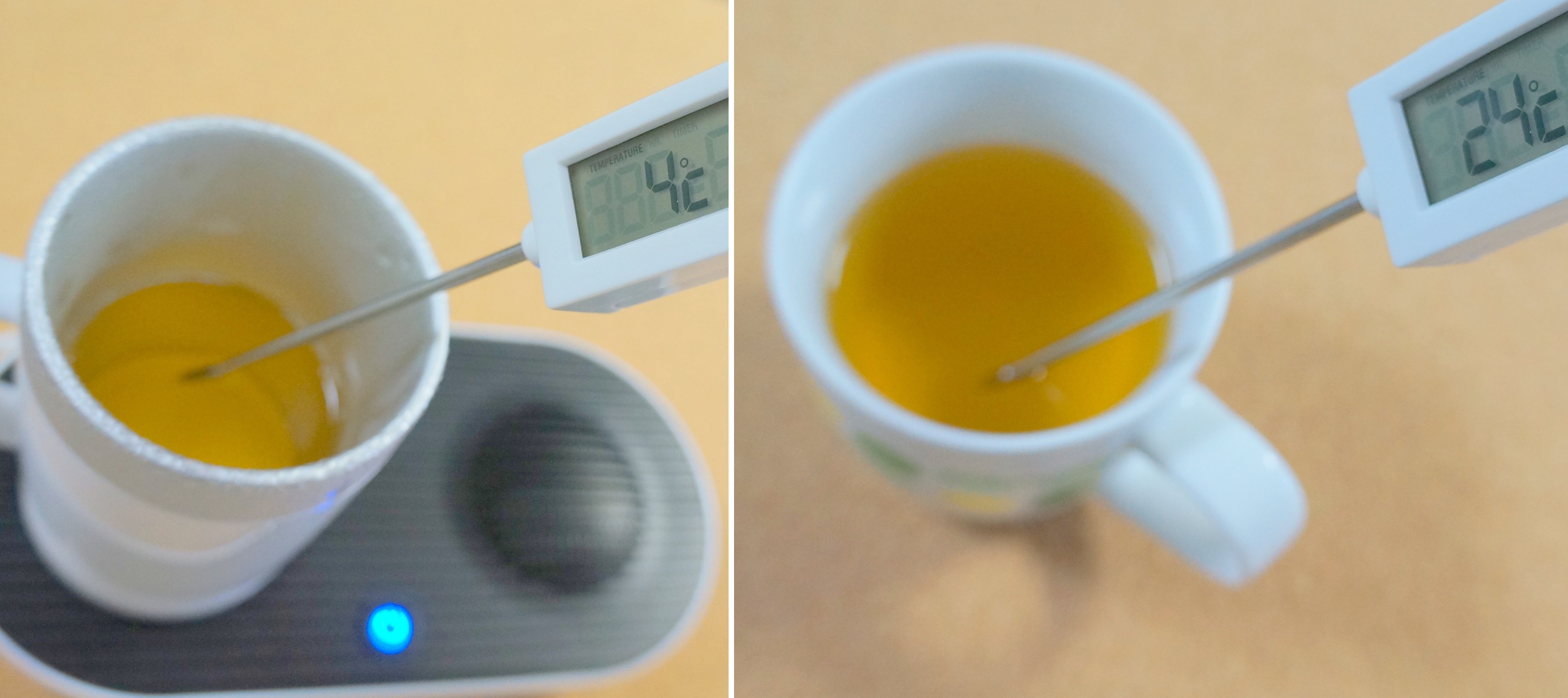「デスクトップ冷熱カップ」に置いたものが4℃、常温のものが24℃でした。保冷するだけなく、13℃もの冷却にも成功した結果に。実際に飲み比べてみても、プレートに置いたあとでは「キーン」という冷たさを感じられました。