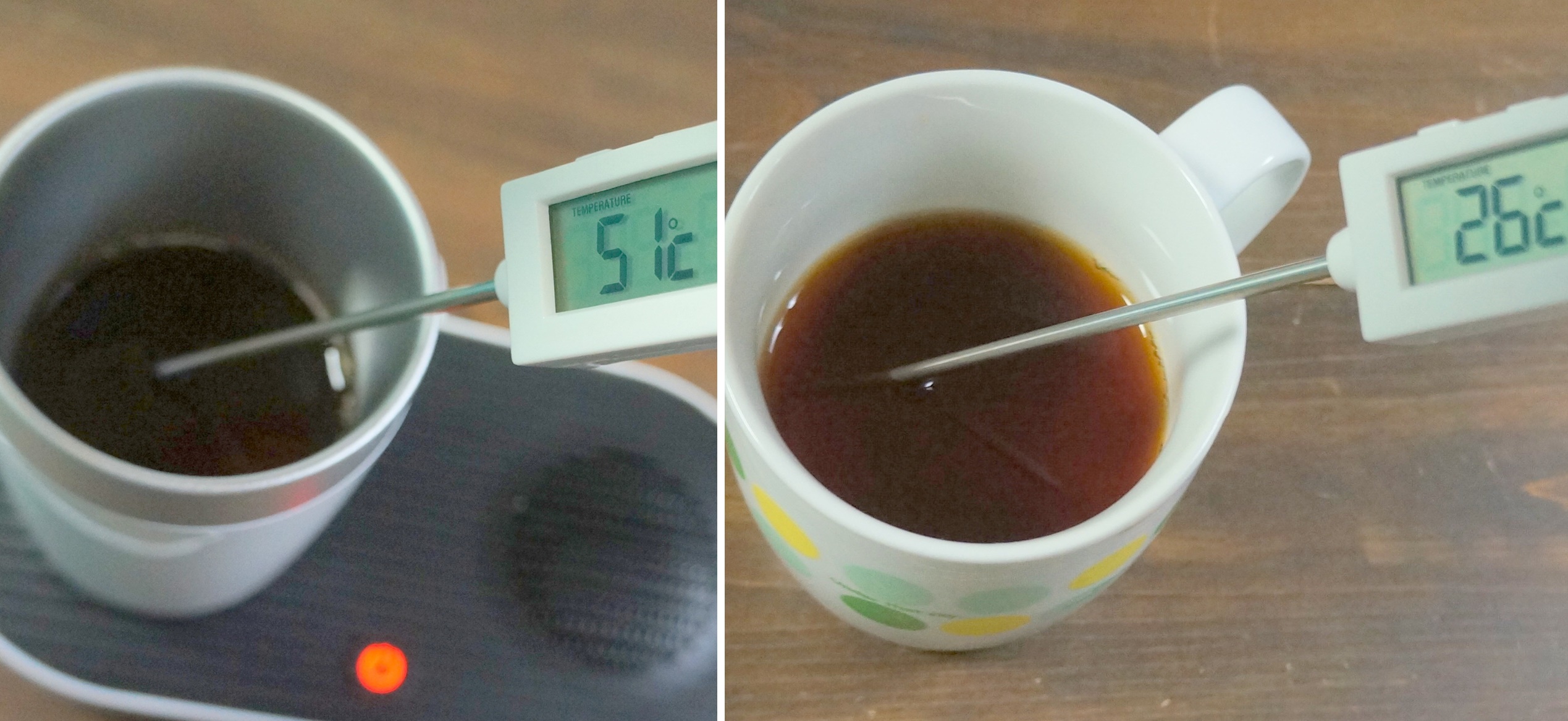 ▲「デスクトップ冷熱カップ」を使った場合(左)。常温保存の場合(右)