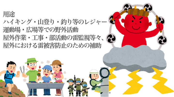 屋外でのレジャーやスポーツ活動時に遭遇する、雷雨を伴うゲリラ豪雨などから身を守ることができます。常に気象状況に気を使って過ごしていれば問題はありませんが、作業や遊びに熱中していると、刻々と変わる気象状況に気が付かないことがあります。気がついたときには、逃げられない状況に陥り、事故に見舞われるというニュースを毎年夏に耳にされるかと思います。