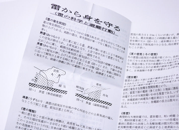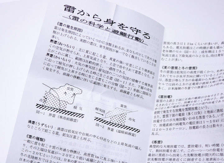 本体製品の他に、取扱説明書とは別に「雷から身を守る為の回避行動の手引き」が付属します。雷雲の発生原理から実際の回避行動の基礎に至るまで詳しく書いていますので、ご購入の際には是非御覧ください。勉強になります!