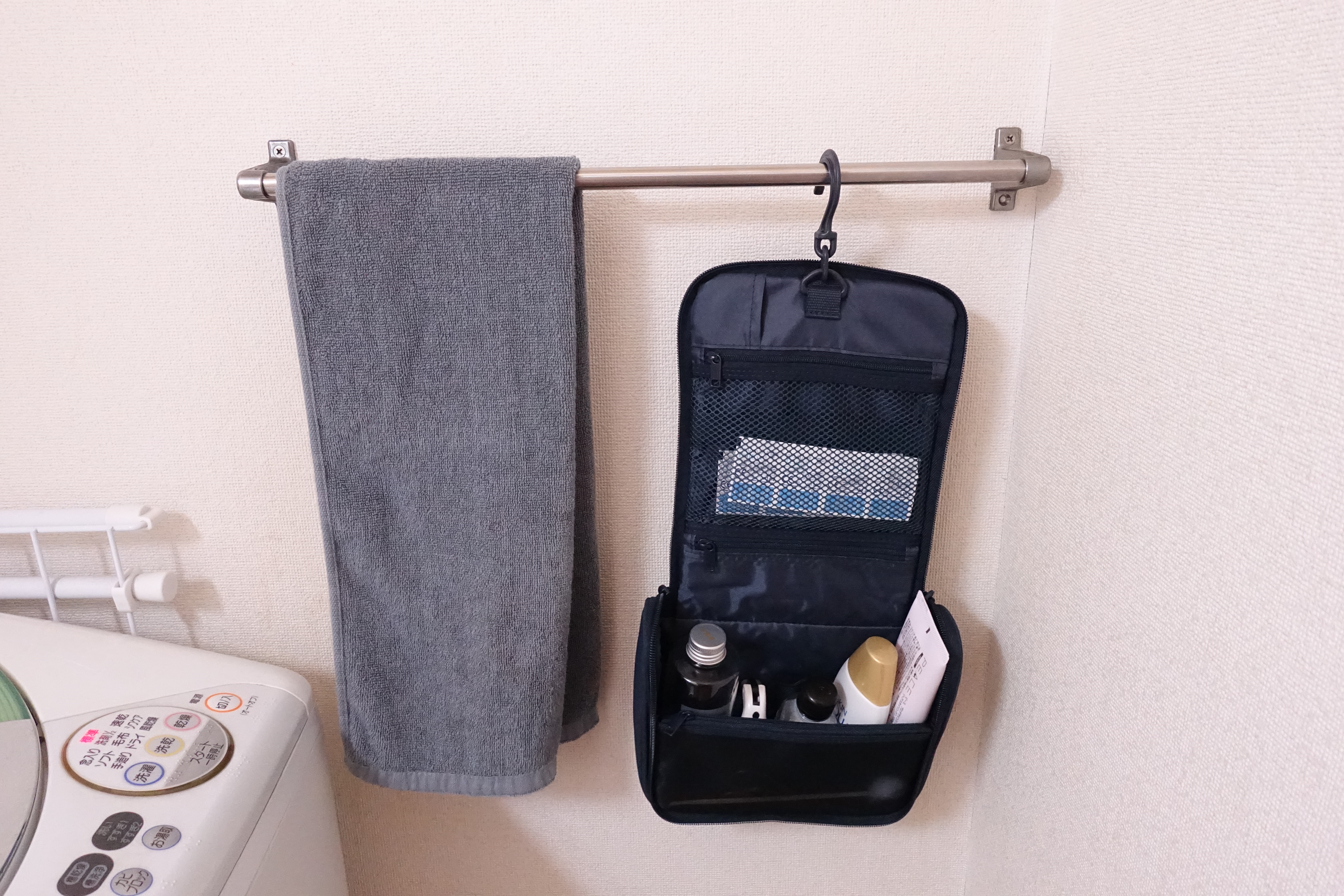 散乱するコンタクトレンズ、電動シェーバーにヘアワックスーー。宿泊したビジネスホテルの洗面台が小さくて、浴室がモノでぐちゃぐちゃという人は多いのではないでしょうか? 無印良品の「ポリエステル吊して使える洗面用具ケース」(1590円)は、タオルバーにケースを引っ掛けるだけで小物類の整理ができるので、洗面台はいつもでどこでもスッキリするんです。