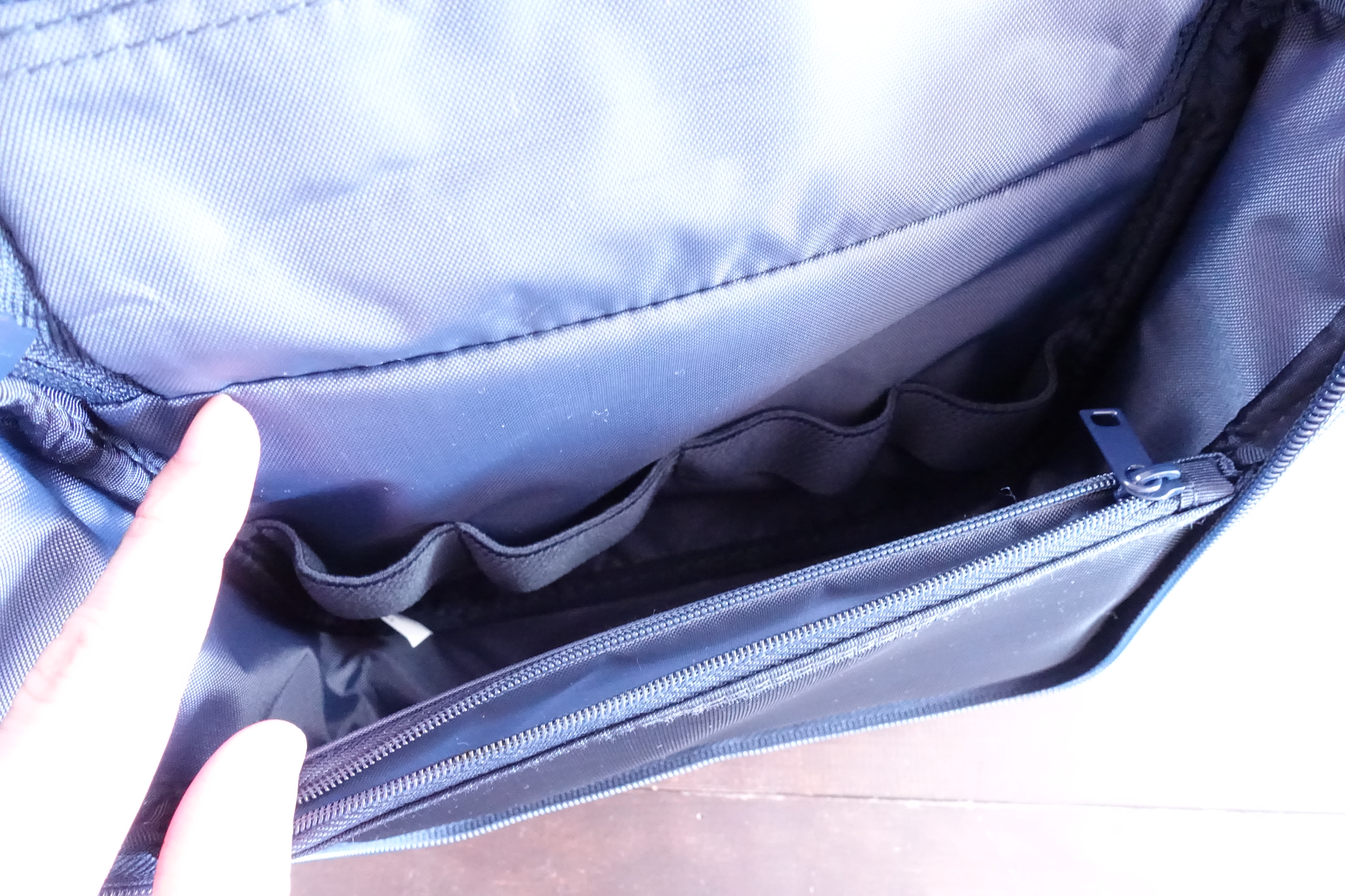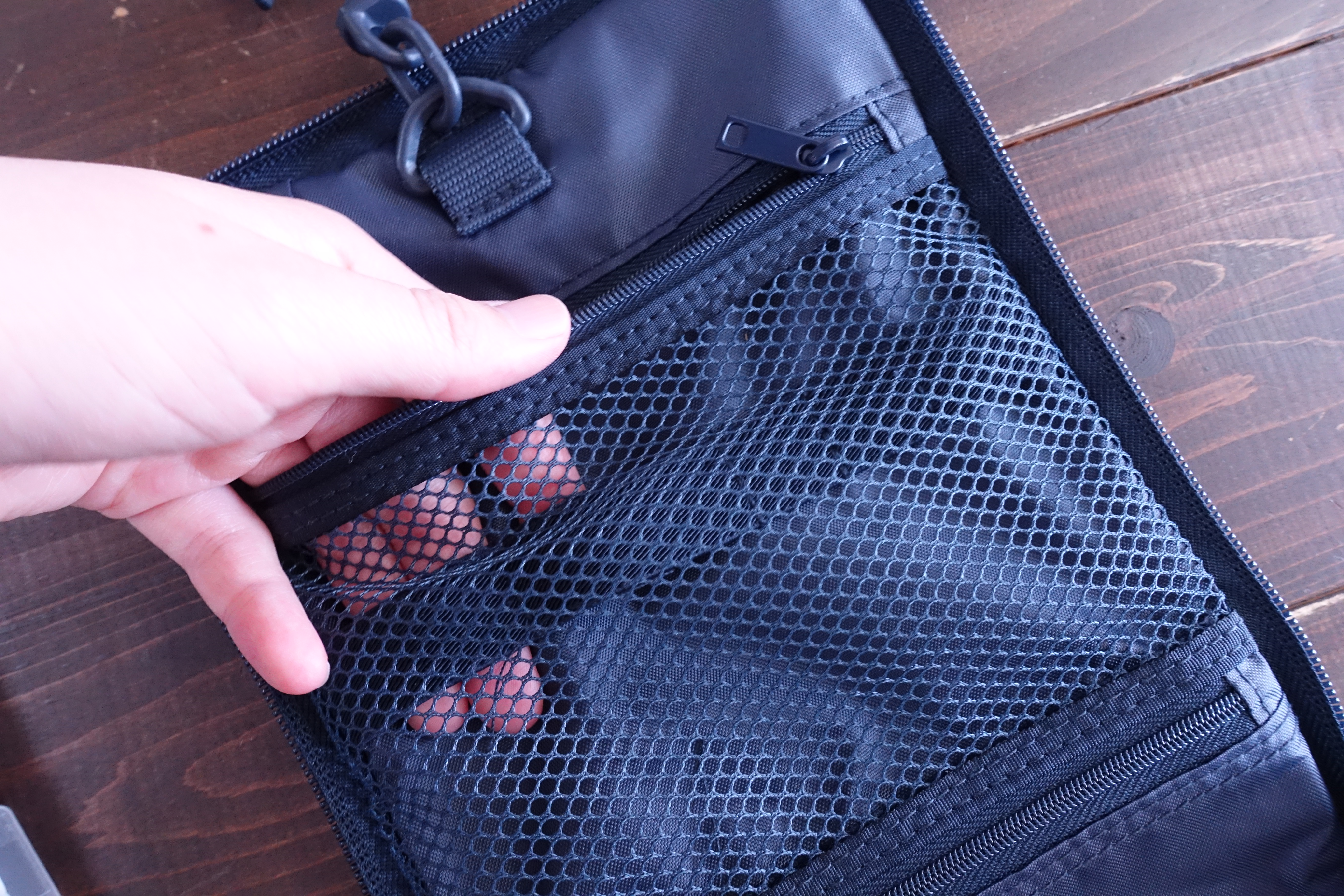 ▲メッシュのポケットには、ゴムバンドのポケットが大2つ、小3つある