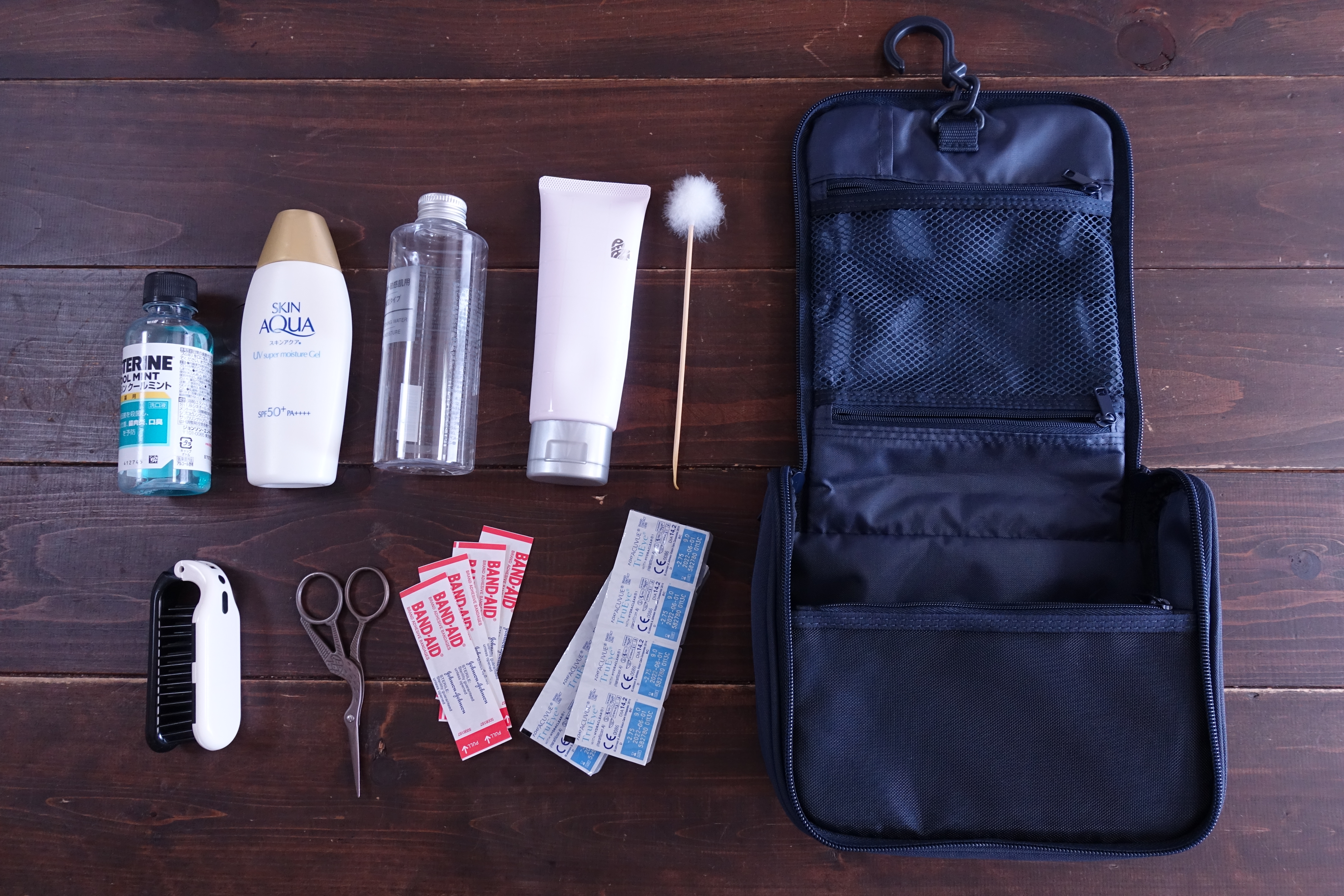 ▲旅先での必需品であるうがい薬、日焼け止め、化粧水、ヘアワックス、耳かき棒、くし、はさみ、絆創膏、使い捨てのコンタクトレンズを「ポリエステル吊して使える洗面用具ケース」に収納