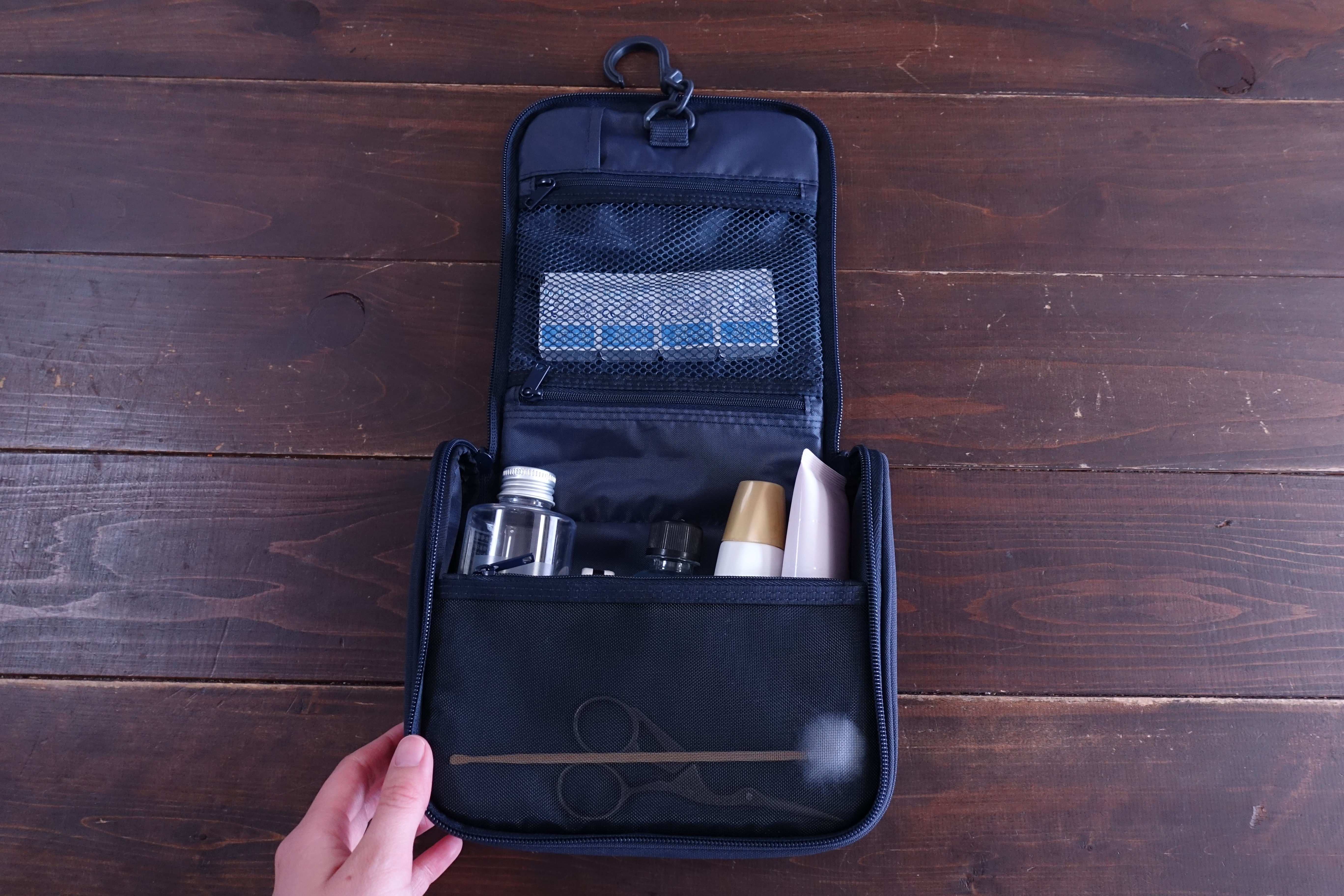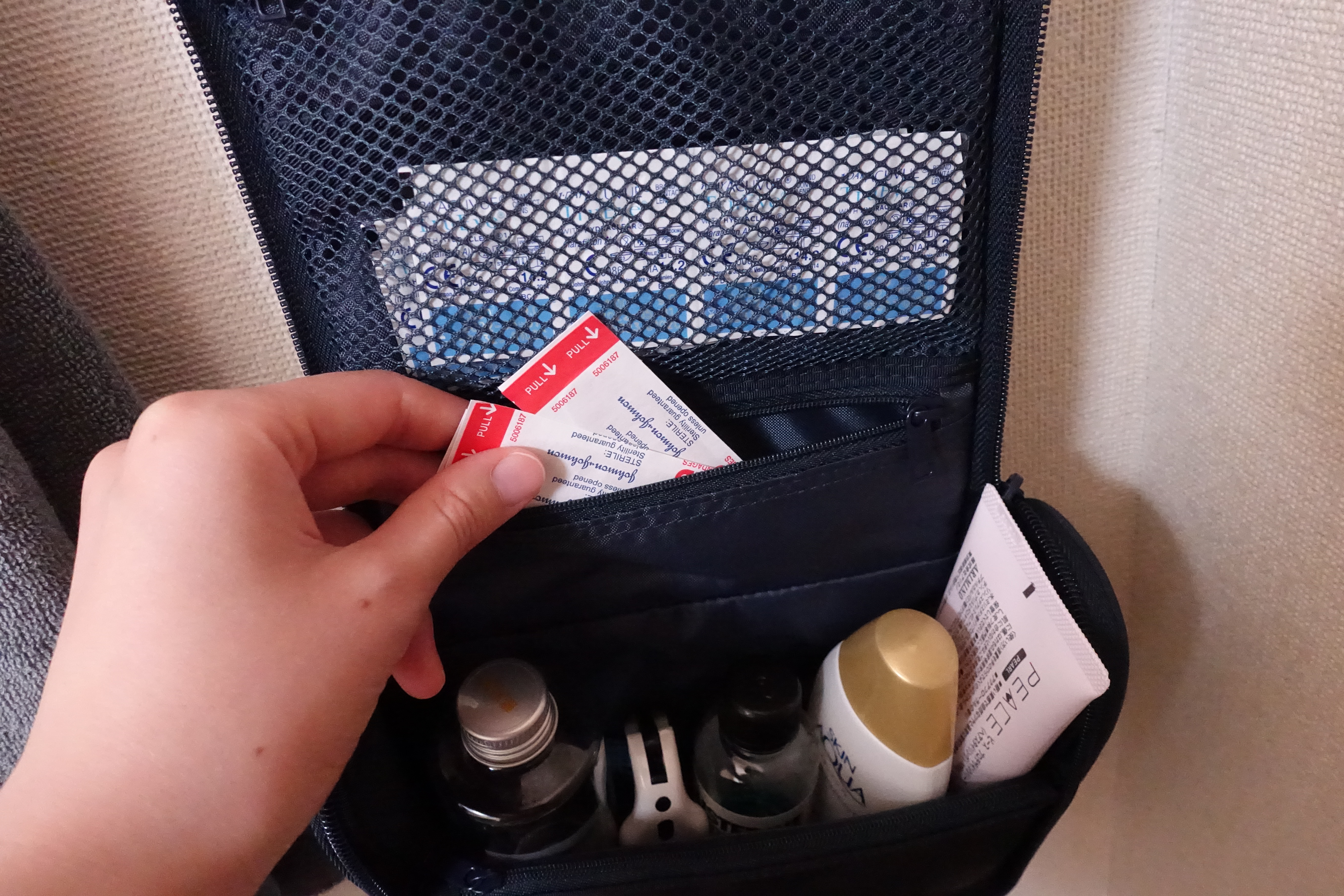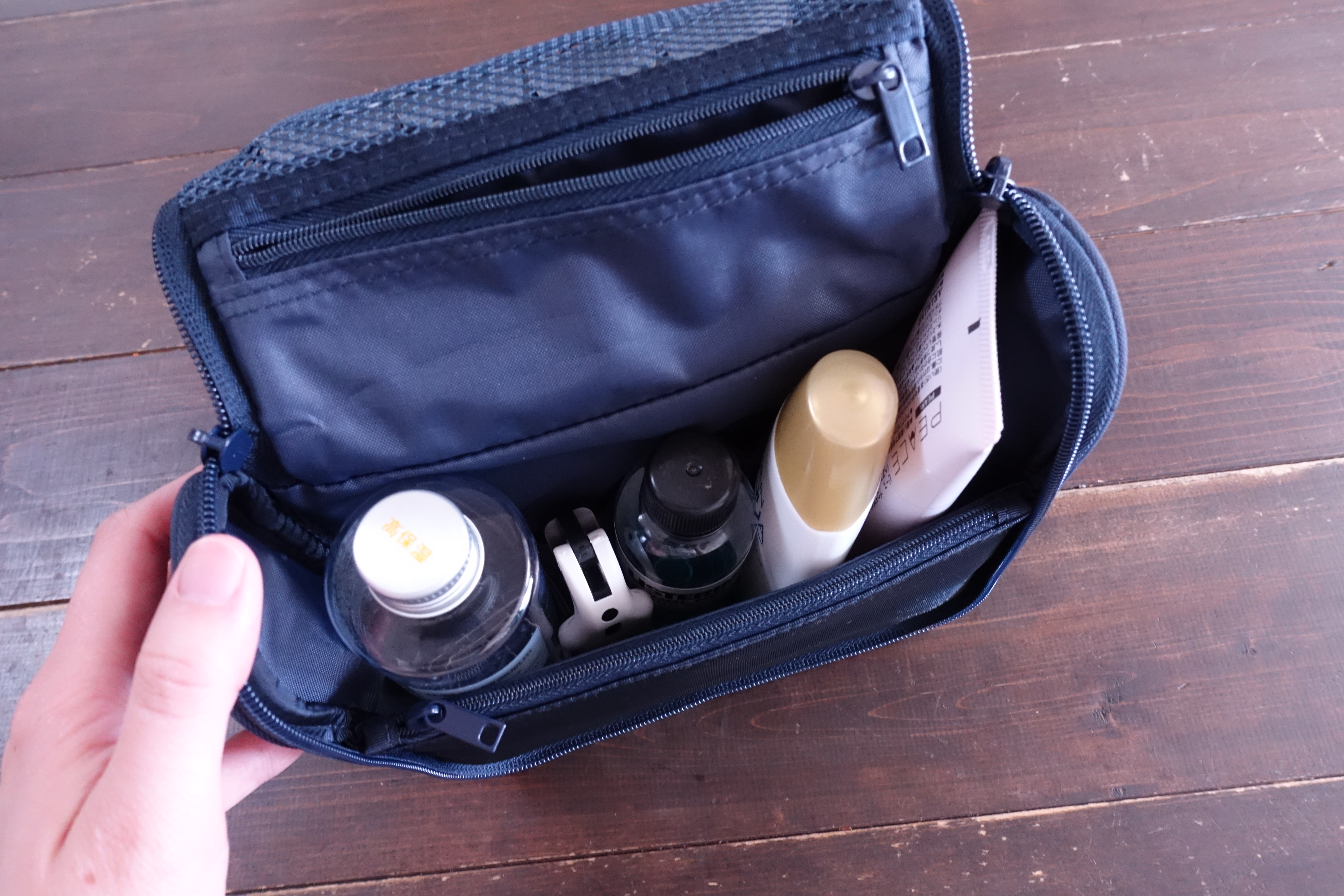 ボトル類はメインポケットに、毎日使うコンタクトレンズは上部のメッシュのポケットに詰めていき、収納完了です。