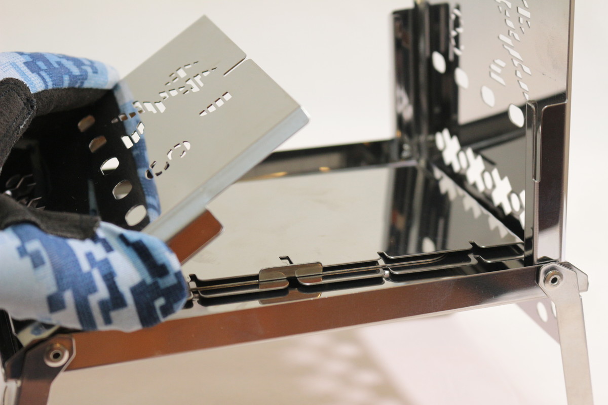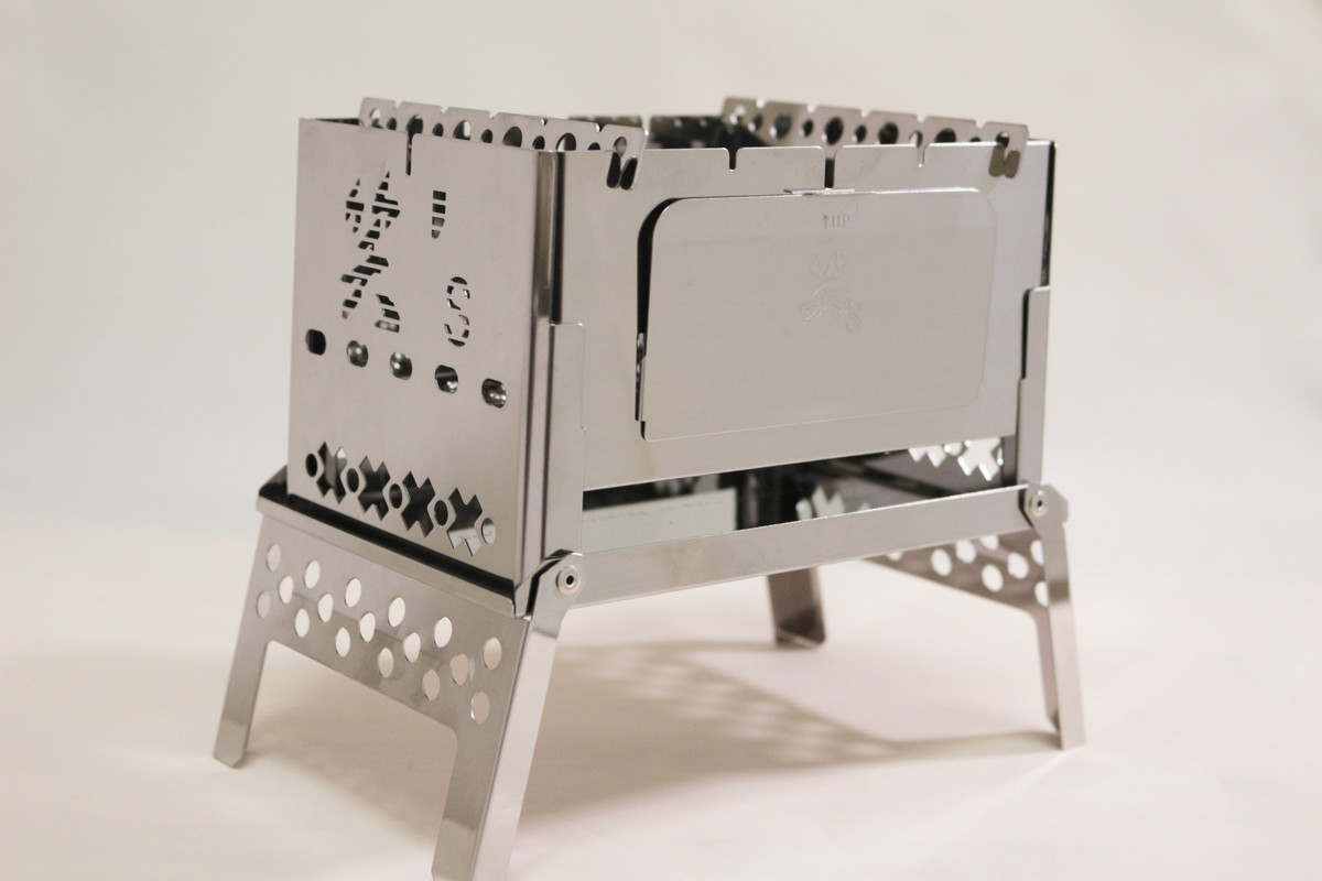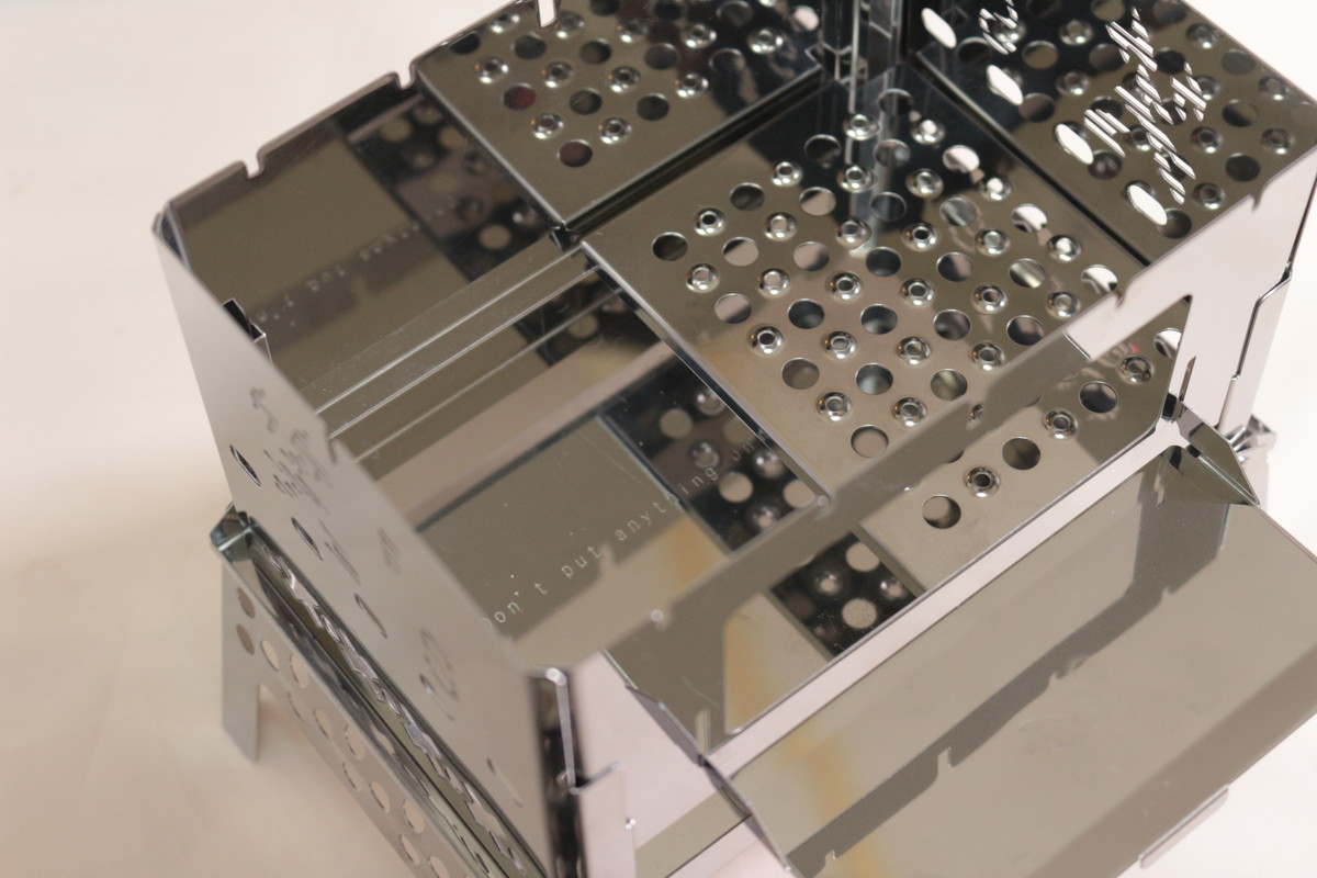 組み立てサイズは215×122×165mmで、静止耐荷重は10kg。ほんのり上がすぼんだ形になっていて、華奢に見えるのに安定感があり、小さなスキレットや小型鉄鍋なら問題なく受け止めてくれます。脚や側面、五徳は適度に肉抜きされていることがわかります。