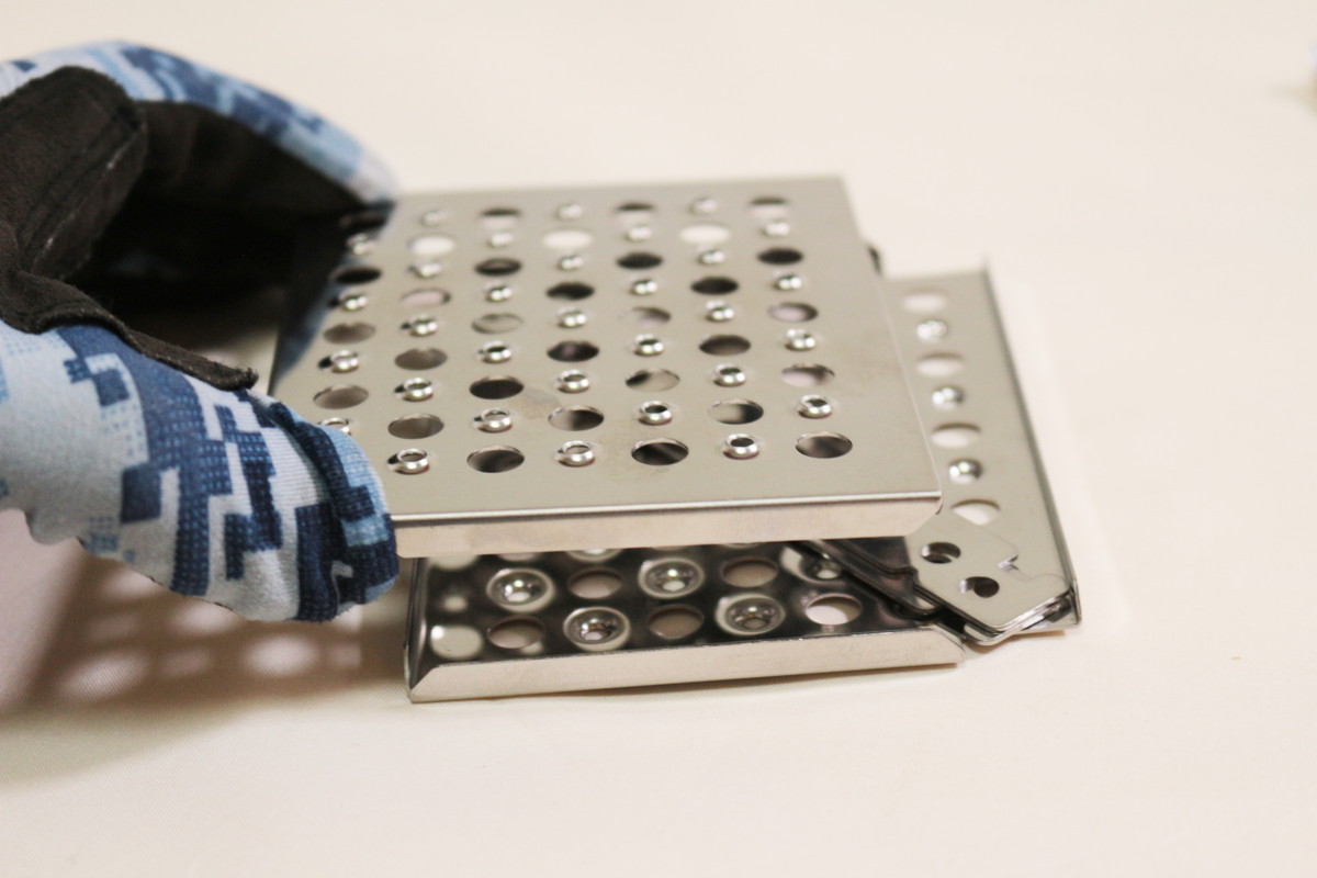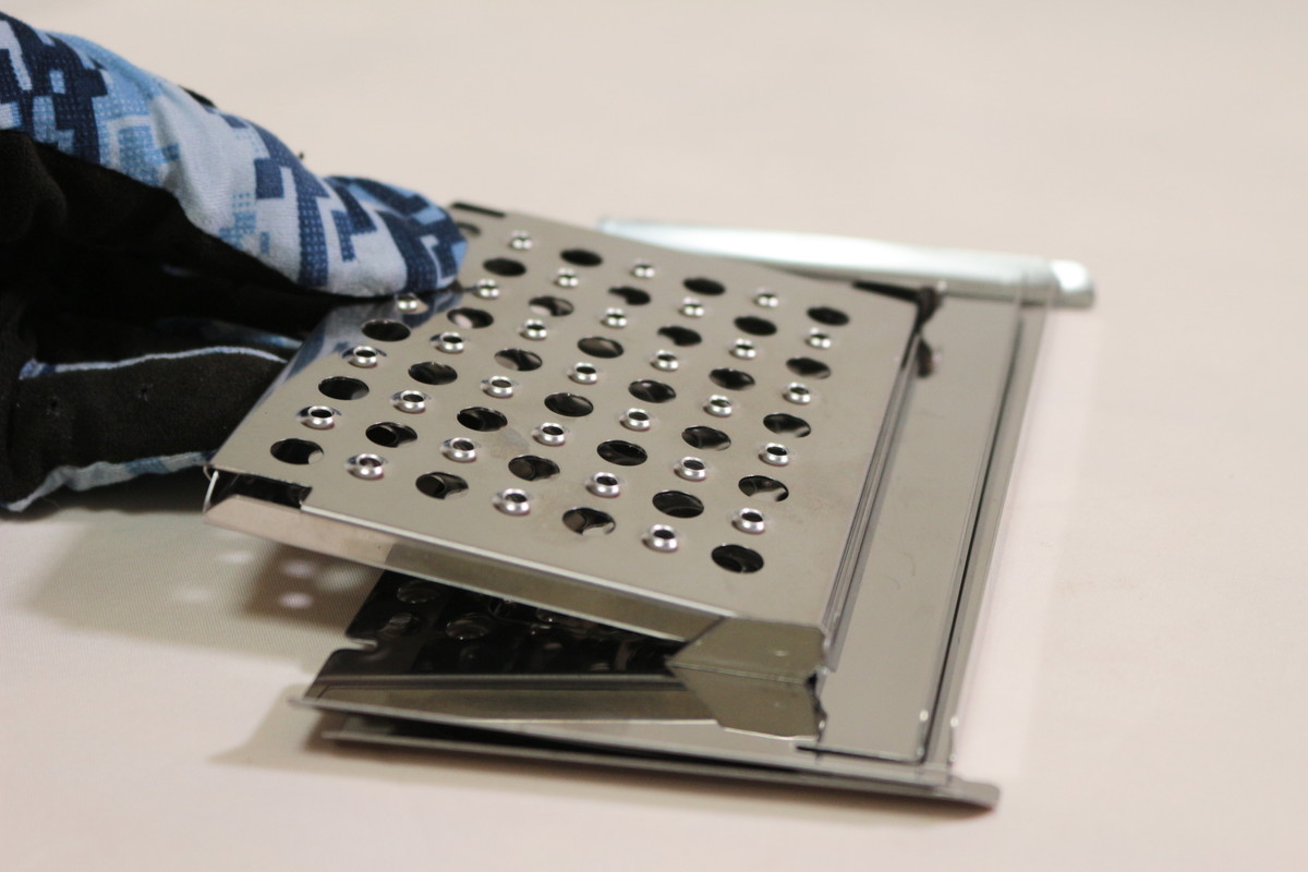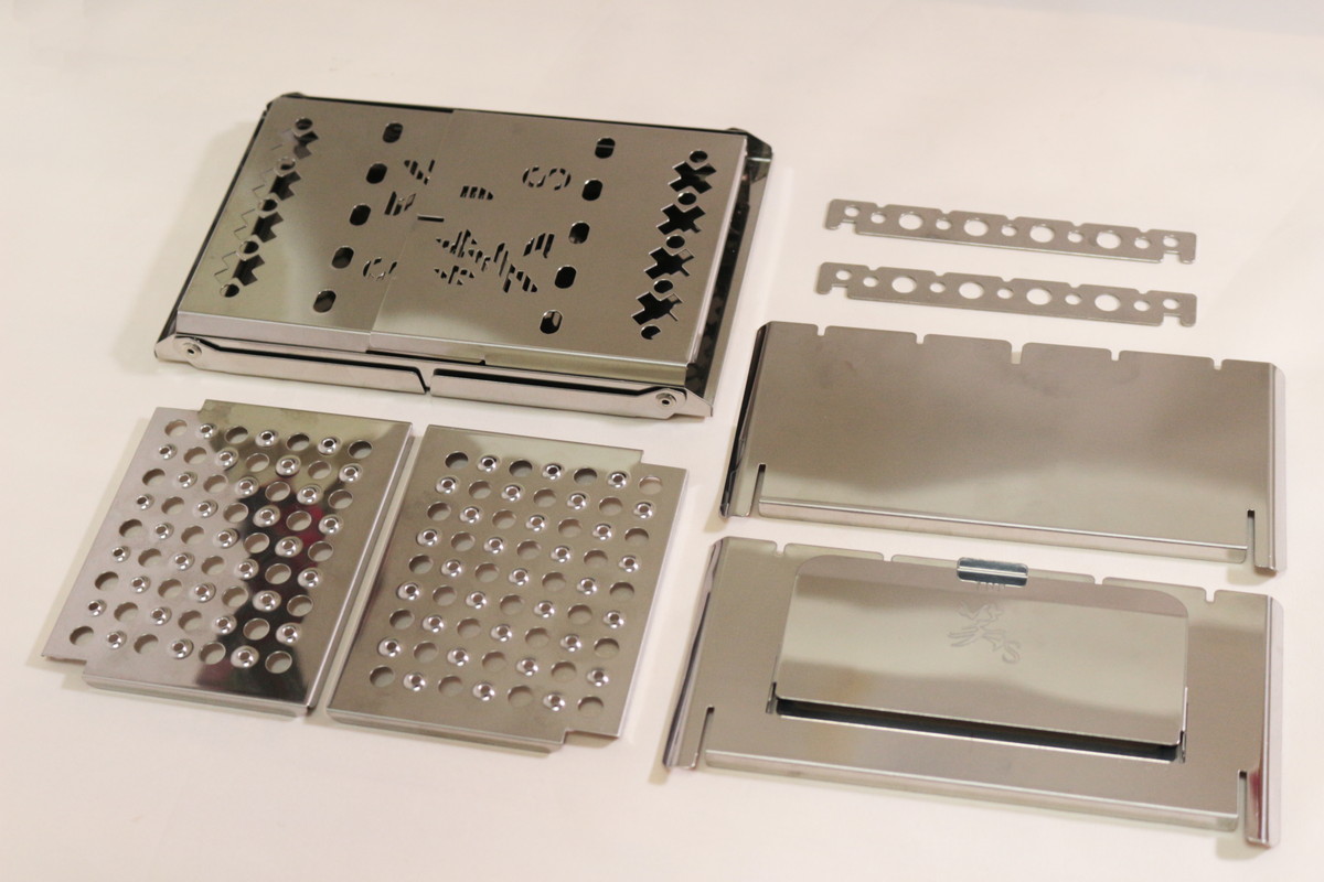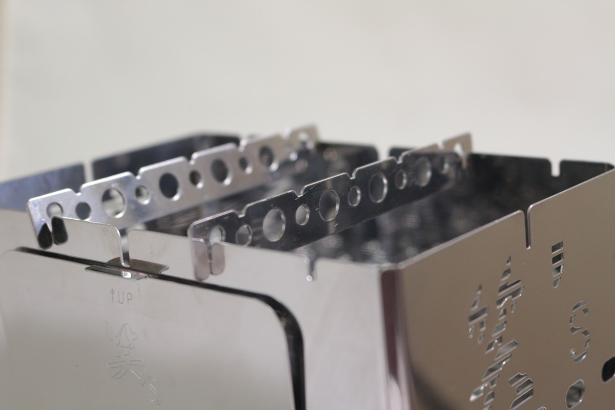 組み立てサイズは215×122×165mmで、静止耐荷重は10kg。ほんのり上がすぼんだ形になっていて、華奢に見えるのに安定感があり、小さなスキレットや小型鉄鍋なら問題なく受け止めてくれます。脚や側面、五徳は適度に肉抜きされていることがわかります。
