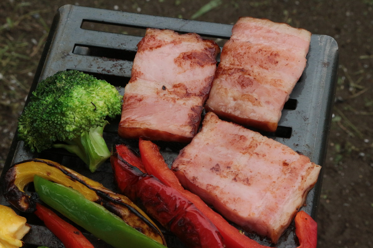 料理用のプレートも用意されています。写真はグリルプレート(700円/税別)で、ほかに半面がスリットなしのH&Hグリルプレート(900円/税別)もあります。脂がほどよく落ちて、おいしく焼き上がりますよ。ただ、どうしても脂が外側に落ちてしまうので、あらかじめアルミホイルなどを敷いておくと安心です。