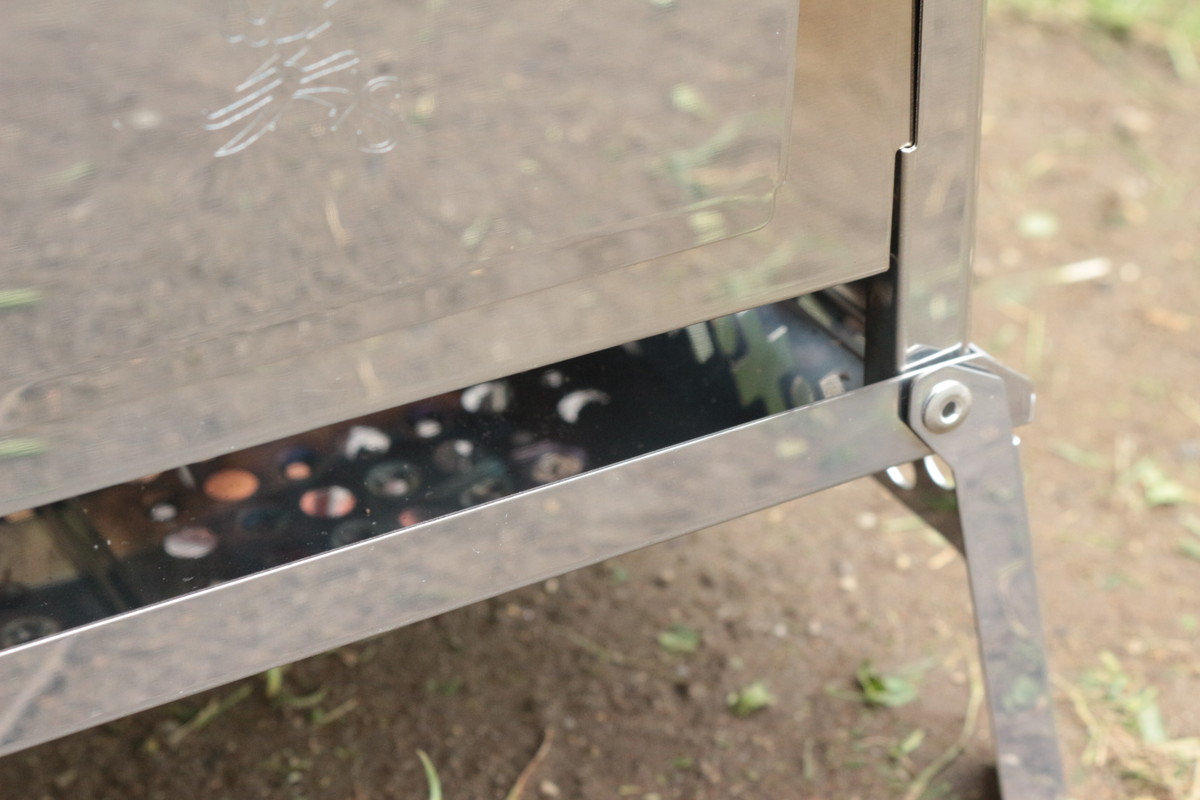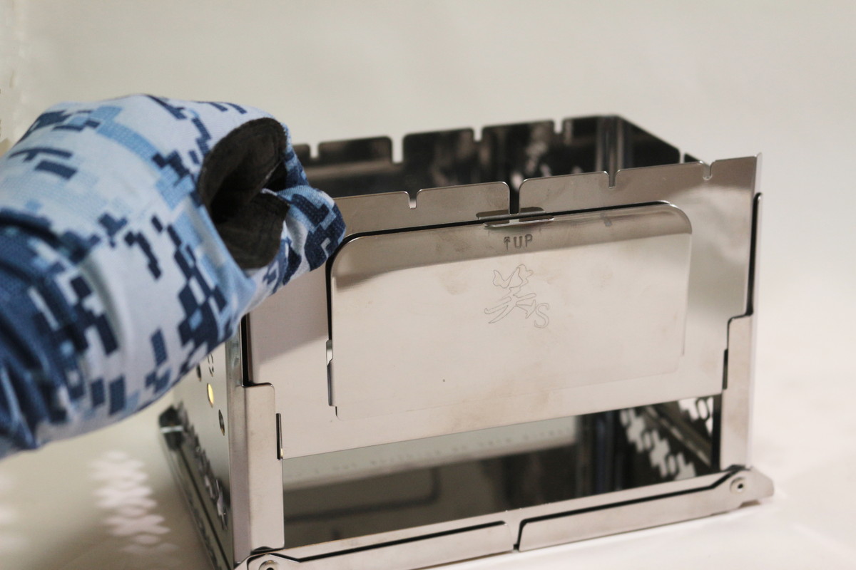 前面の扉は、軽く上げてから手前に引き出します。プライヤーなどを使い、きっちりつまんで開け閉めしましょう。着火剤に火をつけたいときや、調理中に薪や炭を追加、燃焼中により多くの空気を取り入れる、底の灰を取り除きたいときなんかに重宝します。