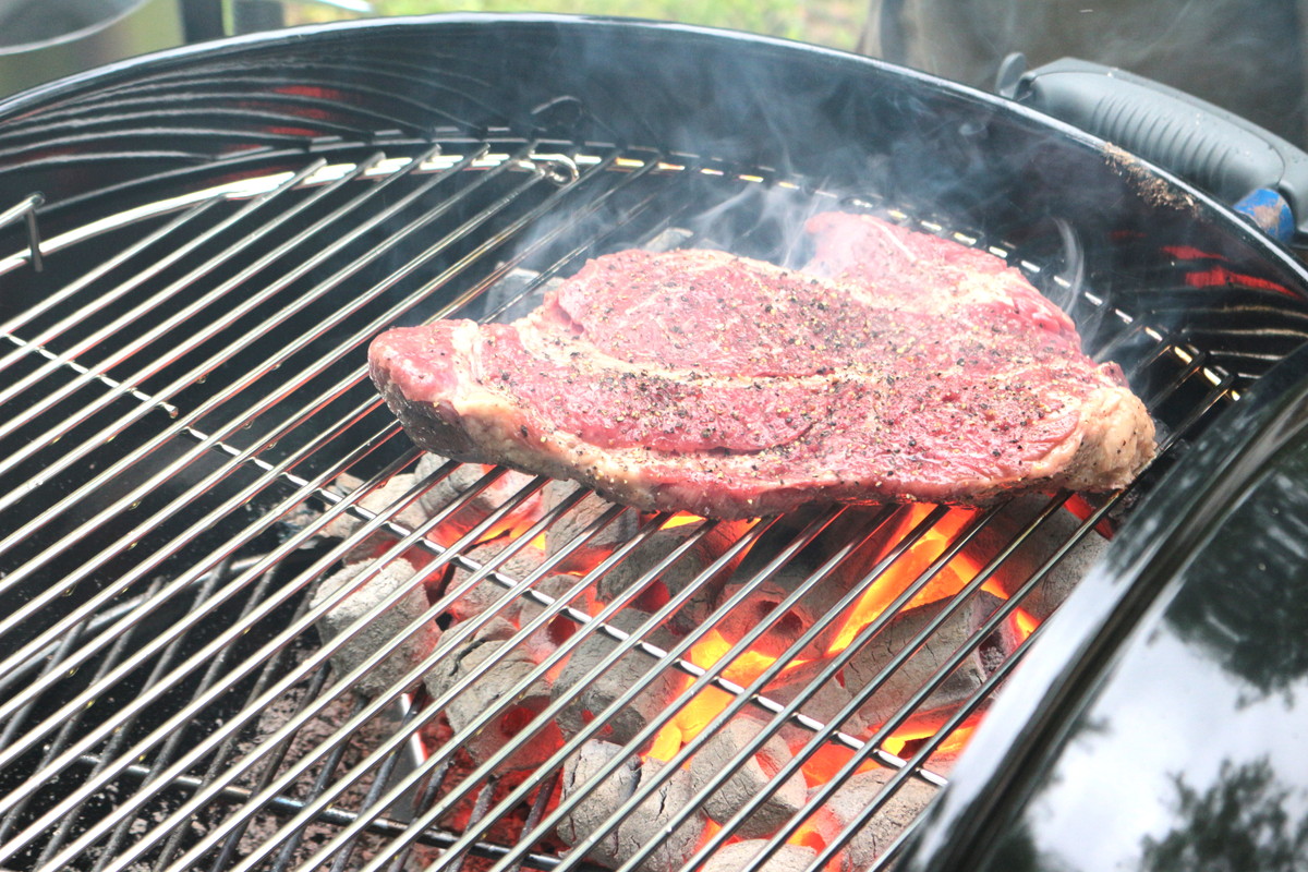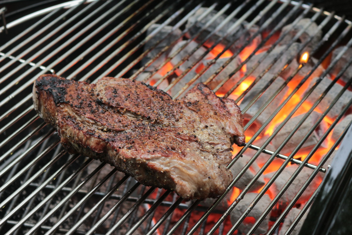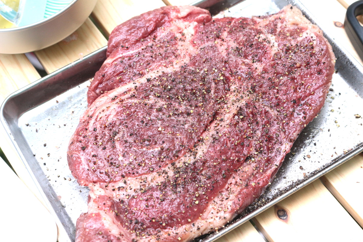 厚み2cm以上の牛肉を用意。焼きはじめる30分ほど前にクーラーボックスから取り出して日陰に置き、常温に戻します。味付けの塩と胡椒はたっぷりと。
