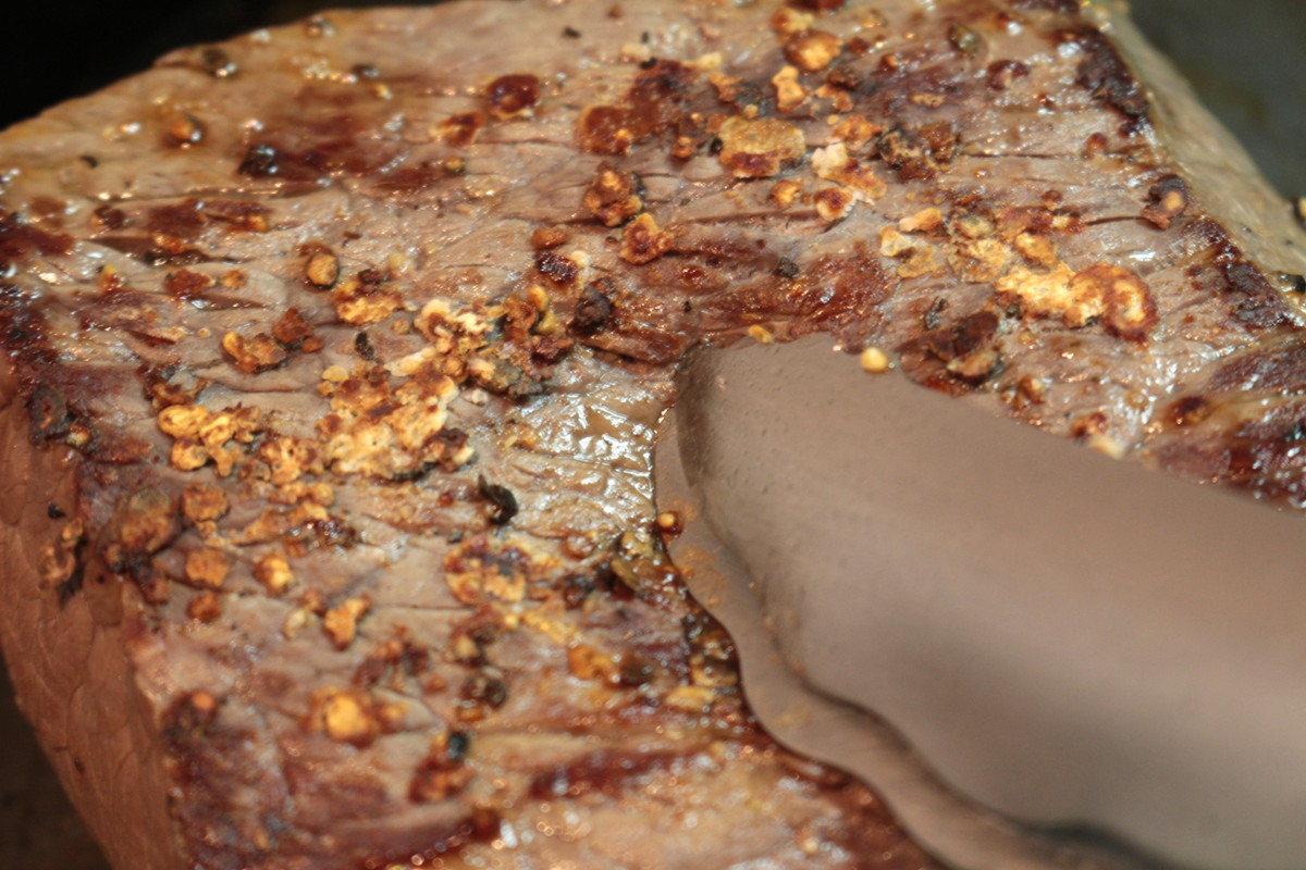 切り分けるとこんな感じ。ジューシーに仕上がりました。ちょっと多めの塩、胡椒は、脂とともに落ちてほどよい味付けになっています。この肉は厚み約3cmでレアに仕上げやすいんですが、薄い肉になるほどタイミングを逃しやすくなります。でも、焼きすぎになったとしてもスモークの風味でカバーされ、おいしく食べられるのでご安心を。