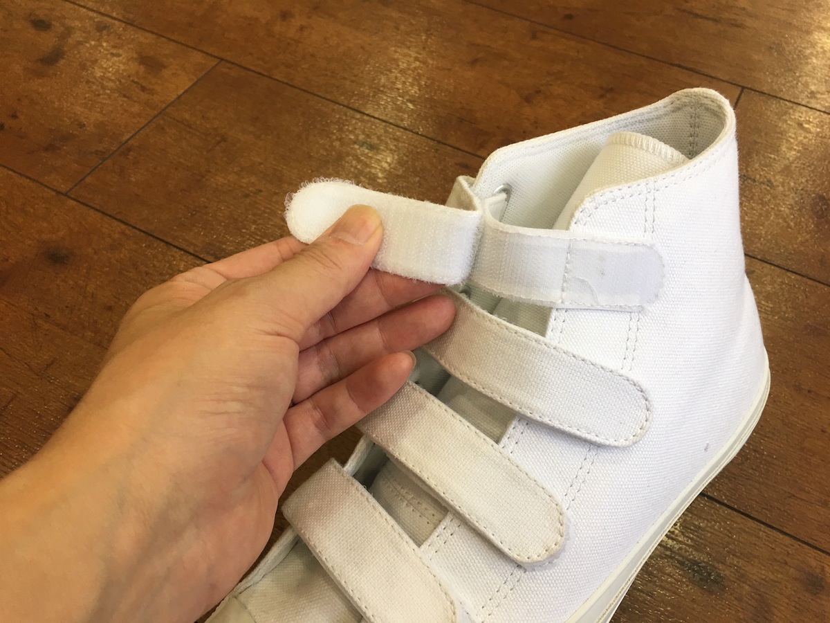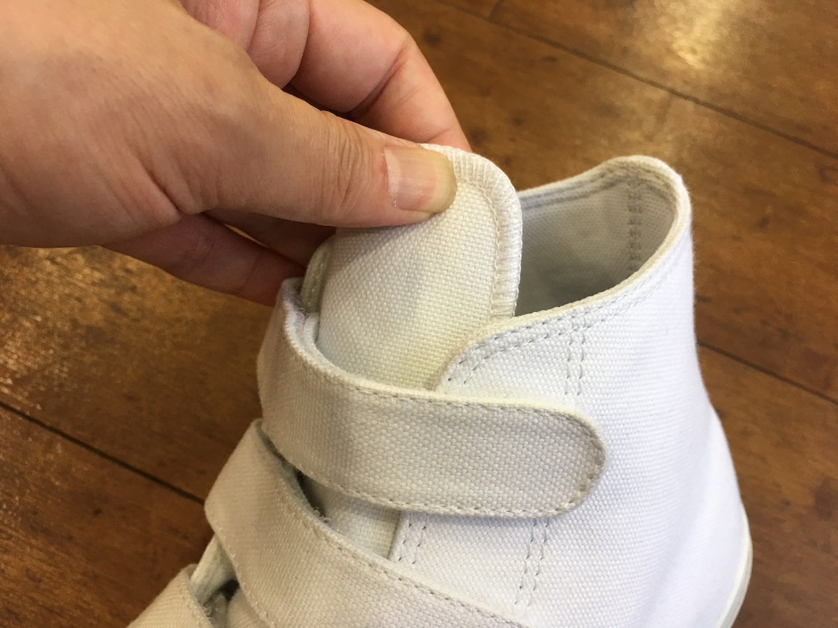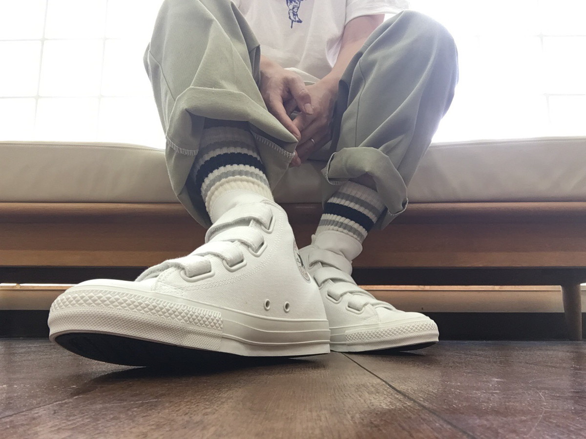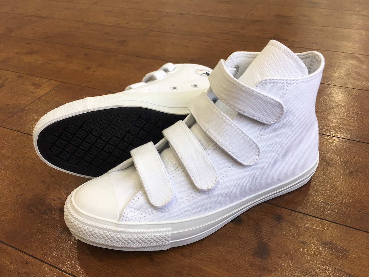 オールホワイトのカラーリングが清潔感溢れてとってもステキです! そして、やはり一番のポイントはベルクロストラップですね! ラクチンになったのはもちろんですが、強いインパクトでシューズ自体のボリューム感も3割増な印象があり、かなり今っぽい雰囲気へと仕上げられています。