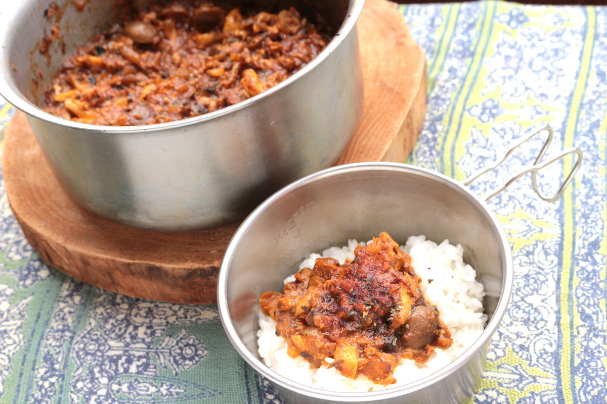 缶詰だから、いつもの肉や魚介よりも煮込み時間は短くてOK。燃料の節約になります。それに、サバはちょっと匂いが強め。サバ缶によっては匂いが気になるのですが、特有の匂いはスパイスの力で封印できるというメリットも見逃せません。