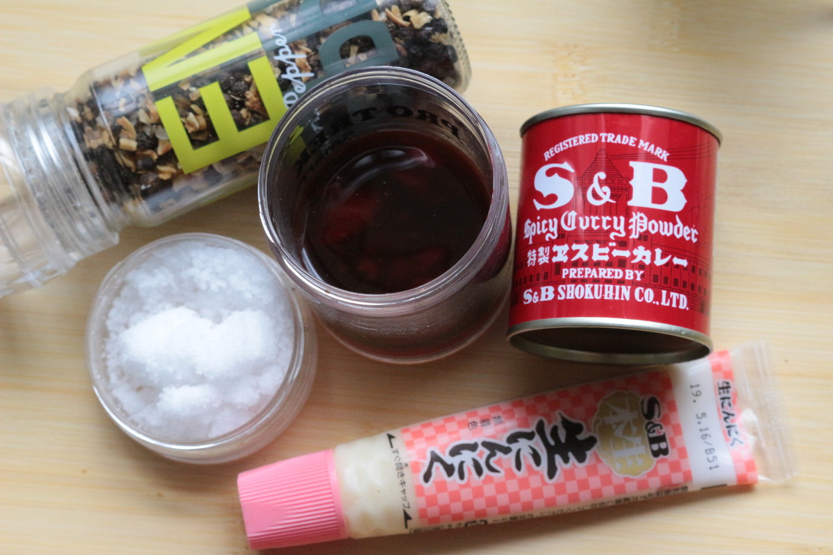 調味料はこんな感じです。右からカレー粉、チューブ入りニンニク、合わせ調味料(ケチャップ大さじ2+ソース大さじ1)、コショウ(写真はレモン入りですが、普通のシンプルなコショウで十分です)、塩。合わせ調味料は自宅でミックスして、密閉容器に入れておくと便利です。