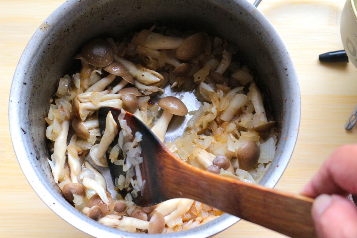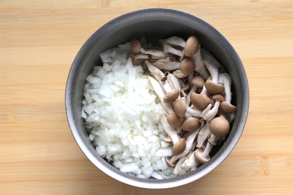 タマネギ(1/2個)は粗みじん切り、シメジ(1/2パック)は石突きを取ってバラバラにしておきます。