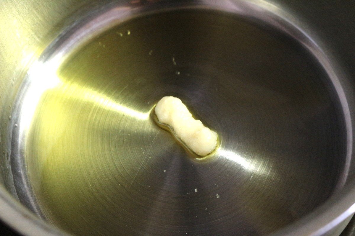 クッカーにオリーブオイル(大さじ1)、チューブ入りニンニク(5cmほど)を入れて、低温でじっくり炒めます。