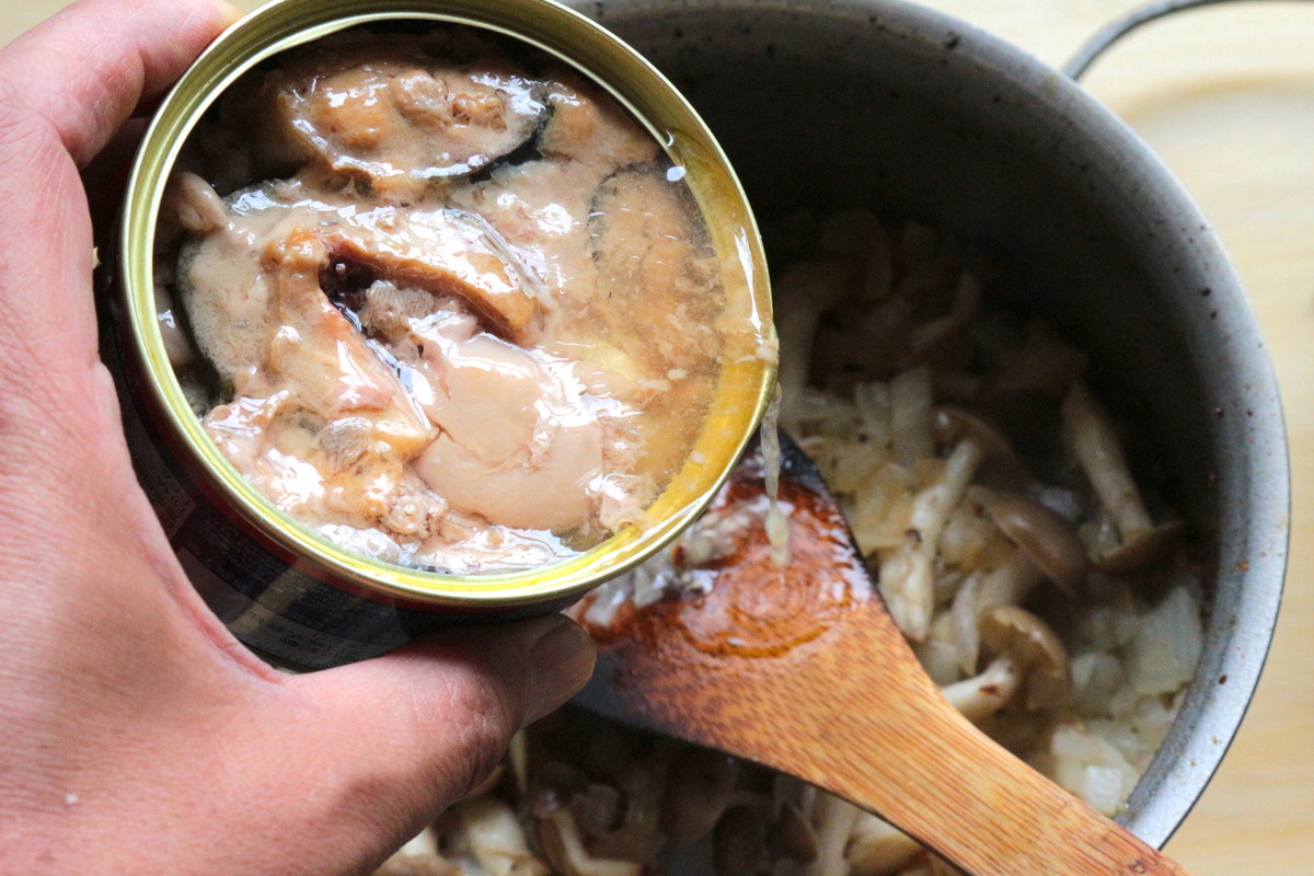 写真では入れ忘れてしまいましたが、サバ缶を投入する前にカレー粉(大さじ1)を加えてしっかり炒めると、スパイスの香りがいっそう引き立ちます。