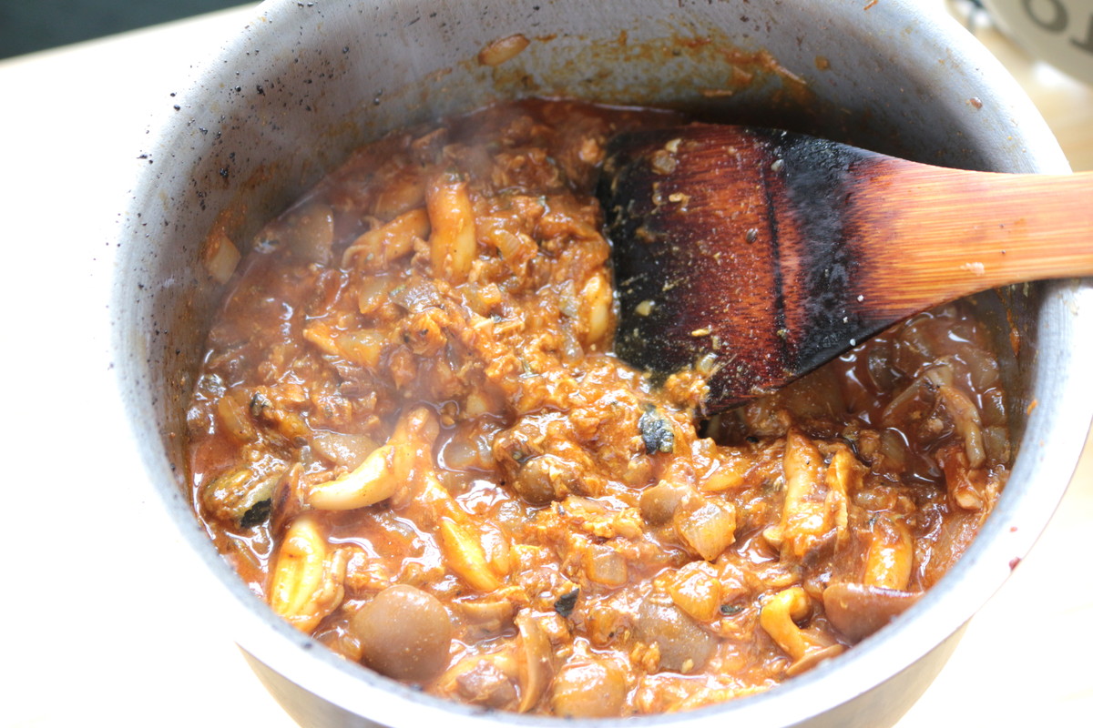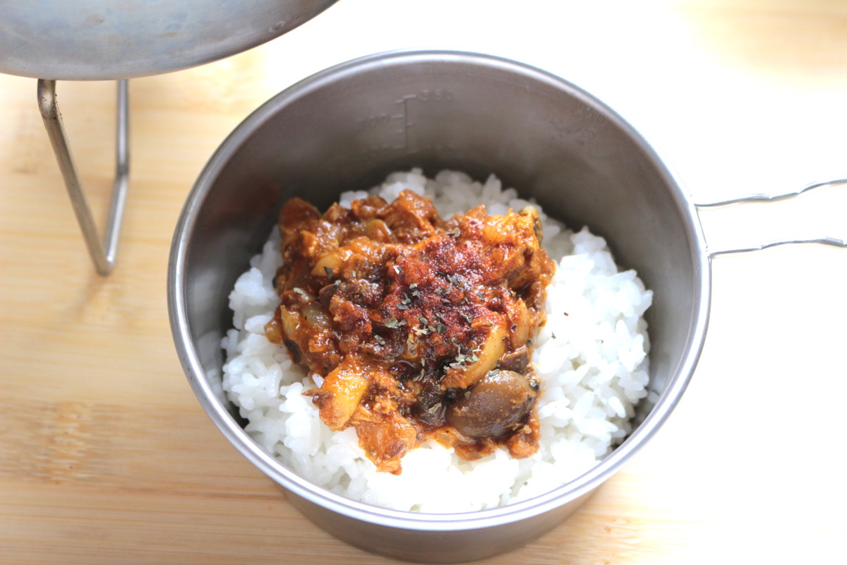 サバ缶をあけて、その中にカレー粉と酒を加えて煮込むという方法もありますが、たっぷりごはんにかけたいのでタマネギとシメジでかさまし。おかげで、サバ缶ひとつでおおよそ3人分のカレーができました。ごはんにのせて熱々のうちに! パンやクラッカーにのせて、酒のつまみにしてもいいですね。