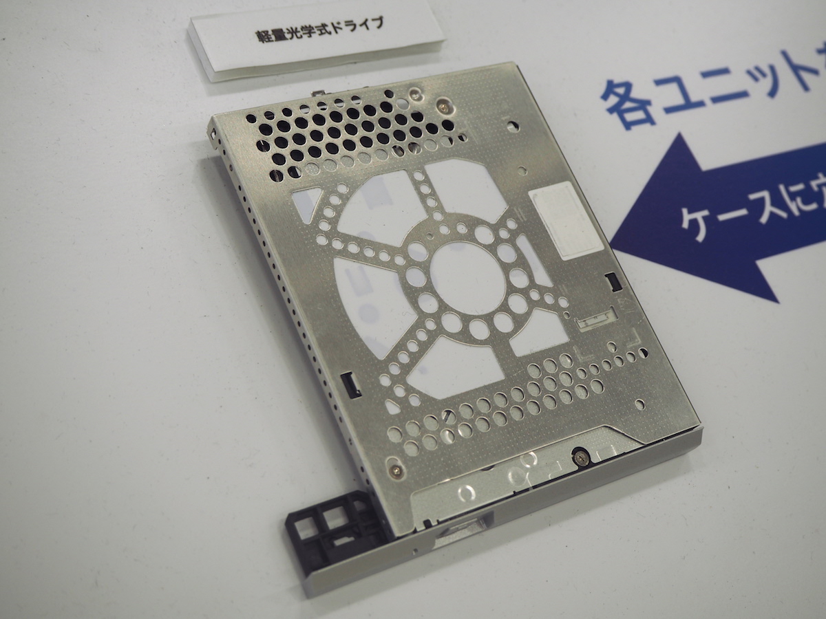 ▲光学式ドライブユニットには、航空機のパーツのように穴を開け、1gでも軽くする工夫がされている