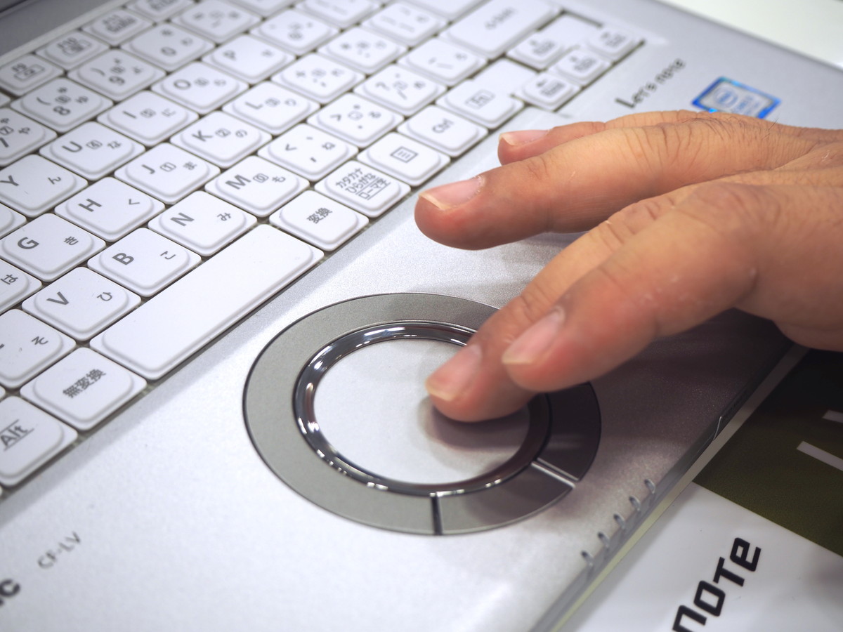 レッツノートのアイコンの一つとも言えるホイールパッドも健在だ。一般的なPCではタッチパッドの形状は四角い。一方「レッツノート」LVシリーズでは円形とし、キーボード入力時に、手のひらなどが誤ってタッチパッドに触れることがない。また、円形のホイールパッドの縁に沿ってくるくるとなぞることで、画面を上下や左右にスクロールできるのだ。このホイールパッドによって、マウスのない環境でも、イライラすることなく操作できることが実感できる。