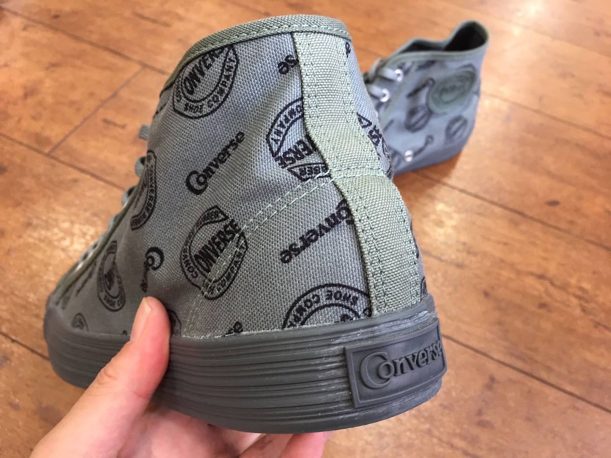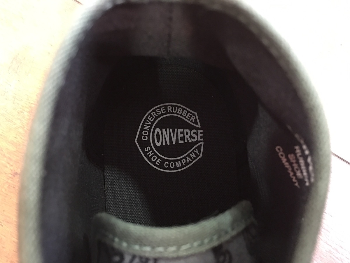 ヒールに縦に設けられたオリーブドラブ色のコットンテープが、ミリタリー向けトレーニングシューズの名残を感じさせます。そしてヒールラベルは、1920年代に使われていたという「Converse」ロゴが使われています。