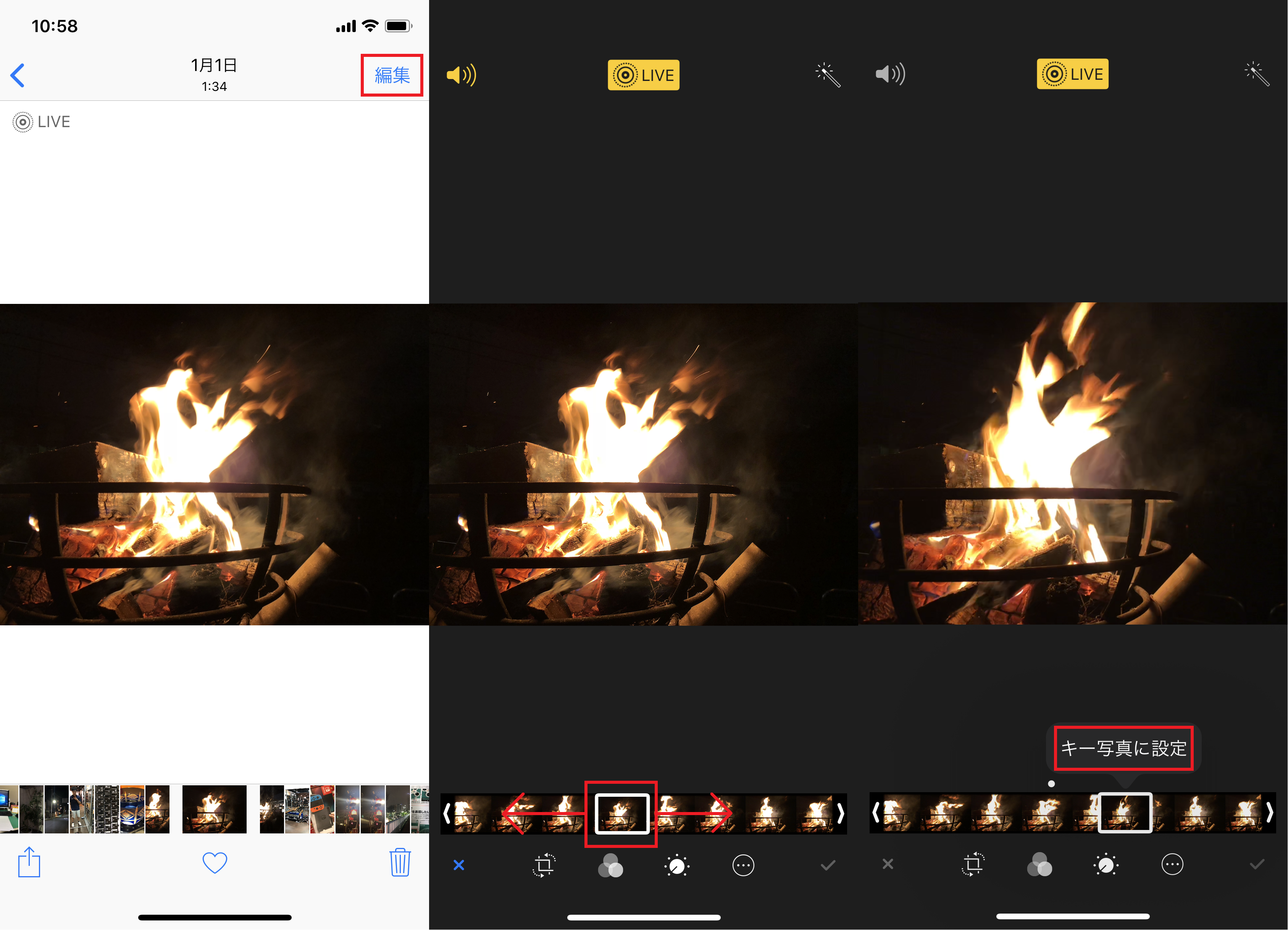 ▲「写真」アプリで「Live Photos」を有効にして撮影した写真を開き、「編集」をタップ(左)。下部に帯状に表示されるサムネイルを左右にドラッグ(中)。写りのよいカットを選び、「キー写真に設定」をタップしよう(右)