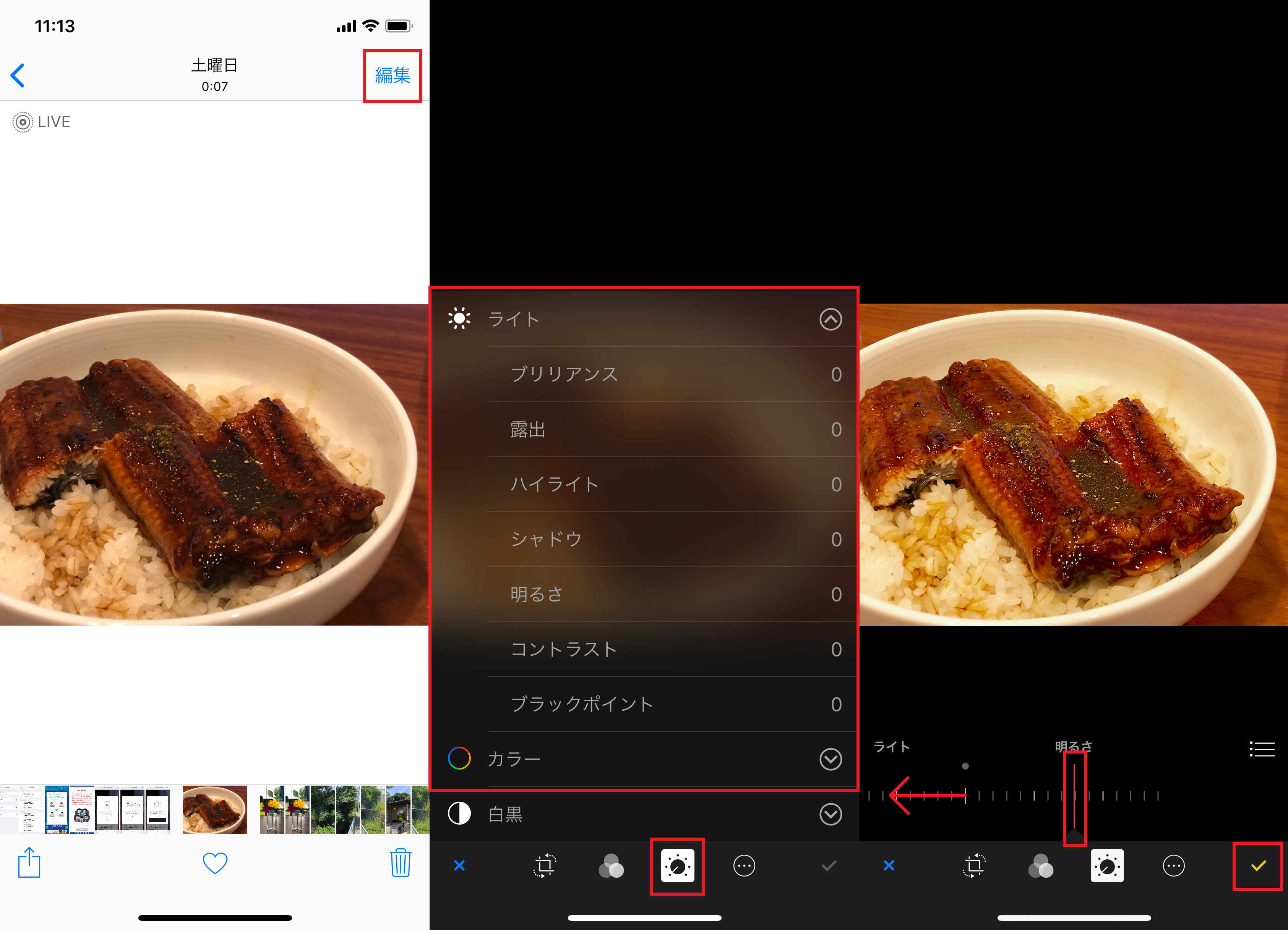 ▲「写真」アプリで「編集」をタップ(左)。ダイヤルのアイコンをタップし、「ライト」と「カラー」の項目を選択。なお「∨」をタップすると詳細な項目が現れる(中)。目盛りを左右にドラッグして明るさや色合いを微調整し、チェックをタップして完了(右)