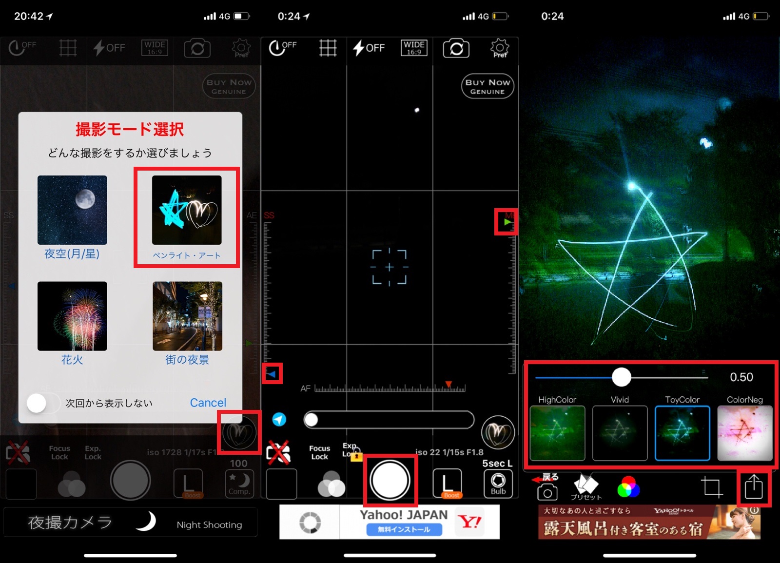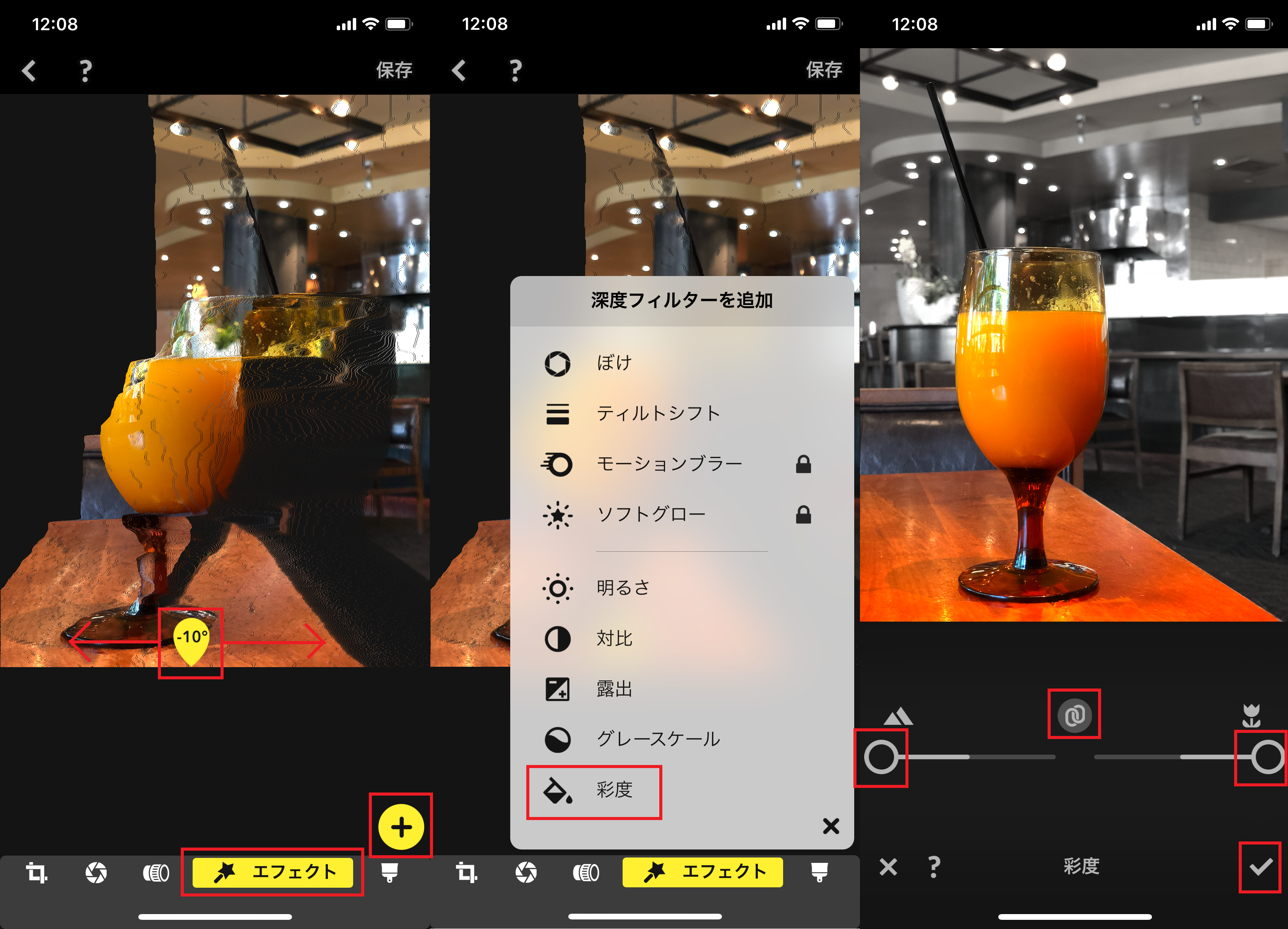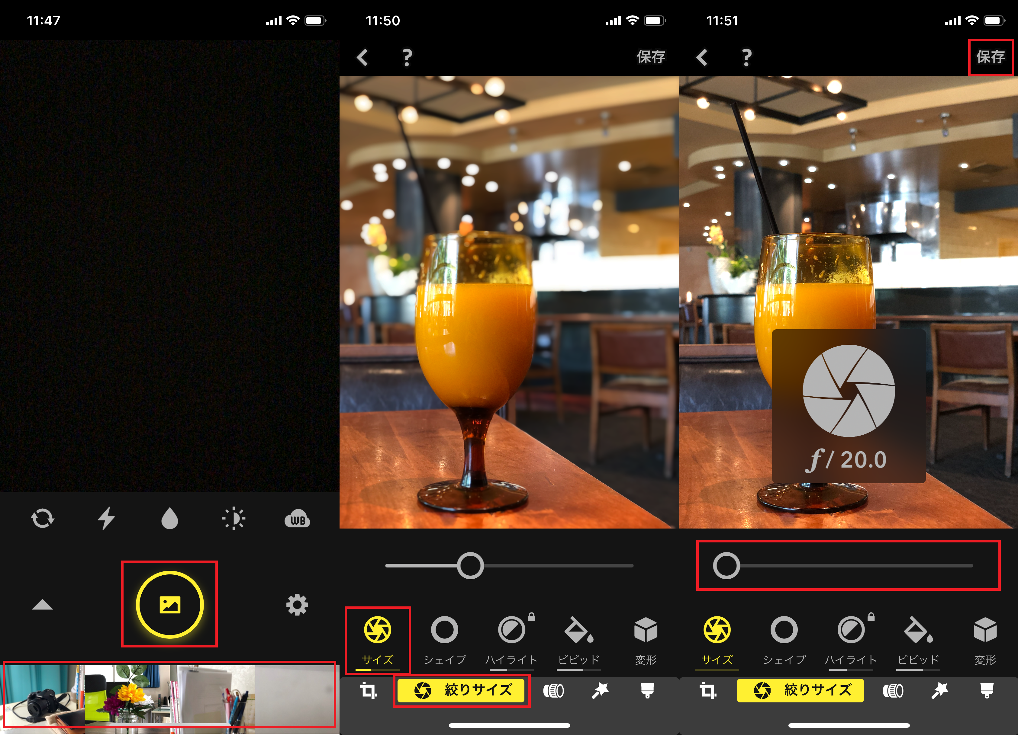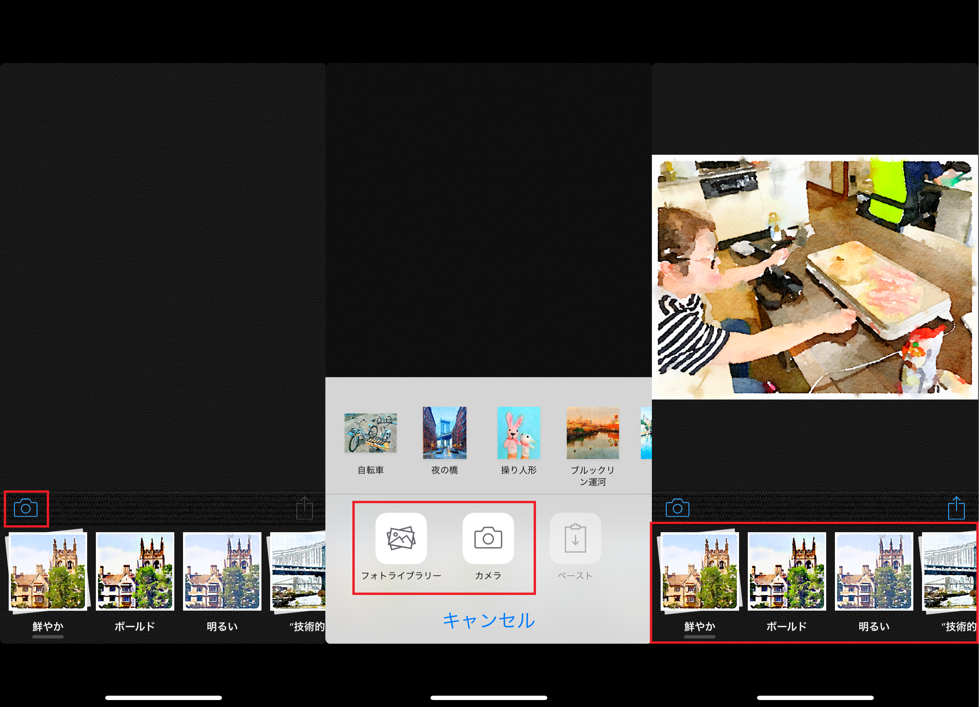 ▲アプリを起動し、カメラアイコンをタップ(左)。「フォトライブラリー」か「カメラ」を選択(中)。選択または撮影した画像が表示されるので、下部からフィルタを選ぶ(右)