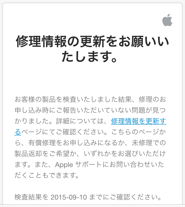 修理の申し込み時には、有償修理についての同意を確認されます。無償修理を希望して届けた場合には、登録したメールアドレスに下記のような「修理情報の更新」メールが届きます。こちらで有償修理を希望するか、または修理せずに返却するかの選択をしましょう。