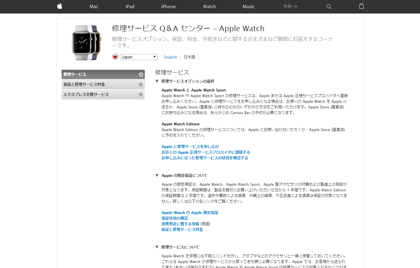 (1)「修理サービス Q&A センター ― Apple Watch」のページを開く。