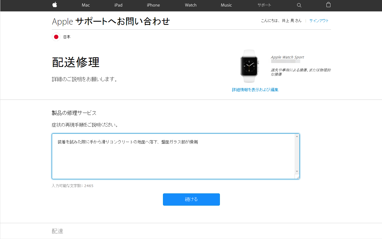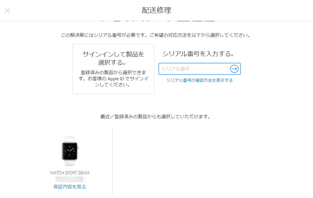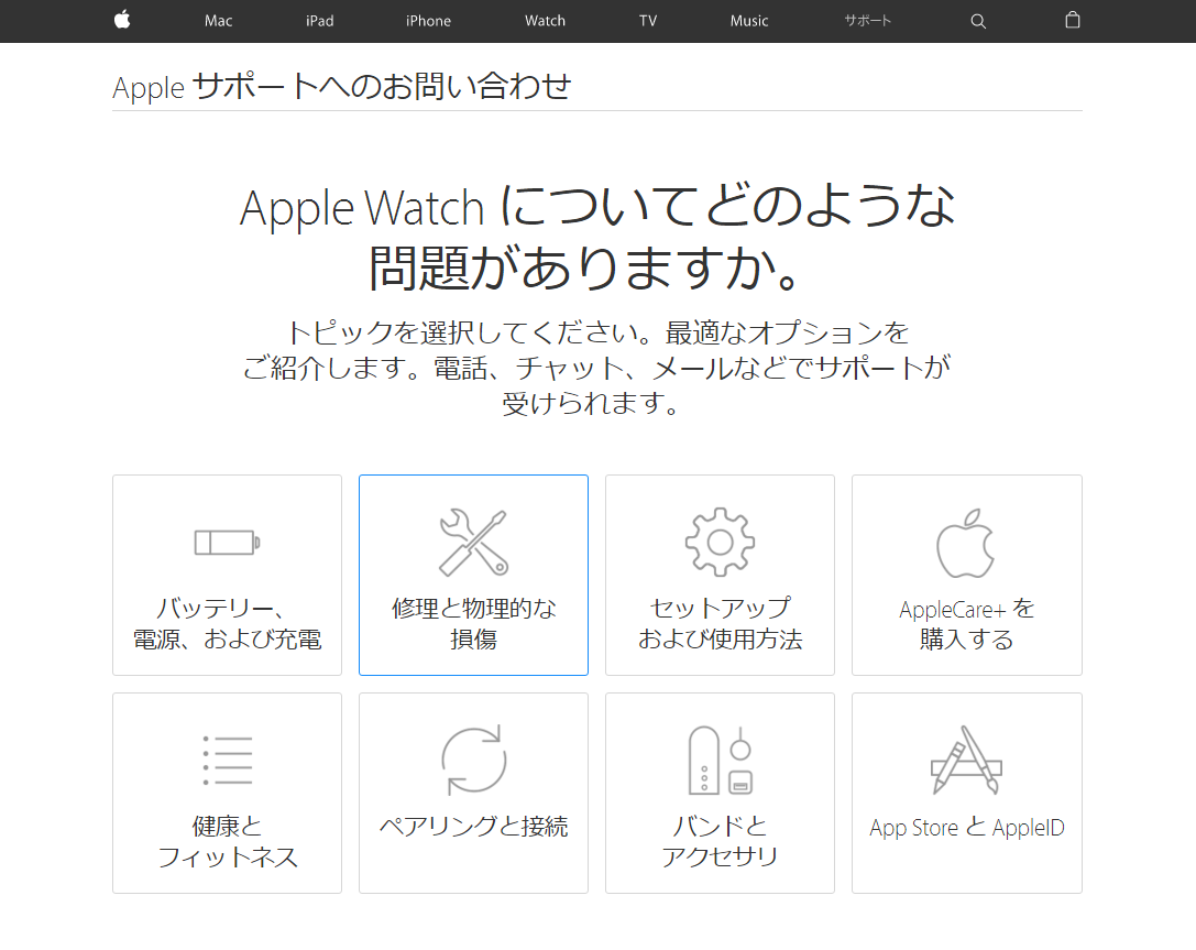 筆者は仕事でもApple Watchを使う機会が多いので、早速修理を試みようと公式サイトから申し込みを行ないました。なお、申し込みの大まかな手順は下記の通りです。