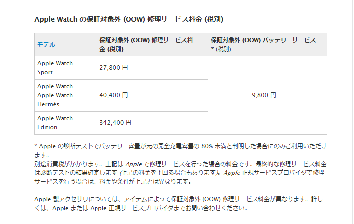 修理の価格は、購入したモデルによって変わります。例えば、Apple Watch(38mmケース/ミラネーゼループ)の場合には、「Apple Care+for Apple Watch」が8200円(税込8856円)となり、サポート適用時の修理費用は9800円(税込1万584円)になります。また、Apple Care+非加入時には、サービス料として4万400円(税込4万3632円)が掛かります。