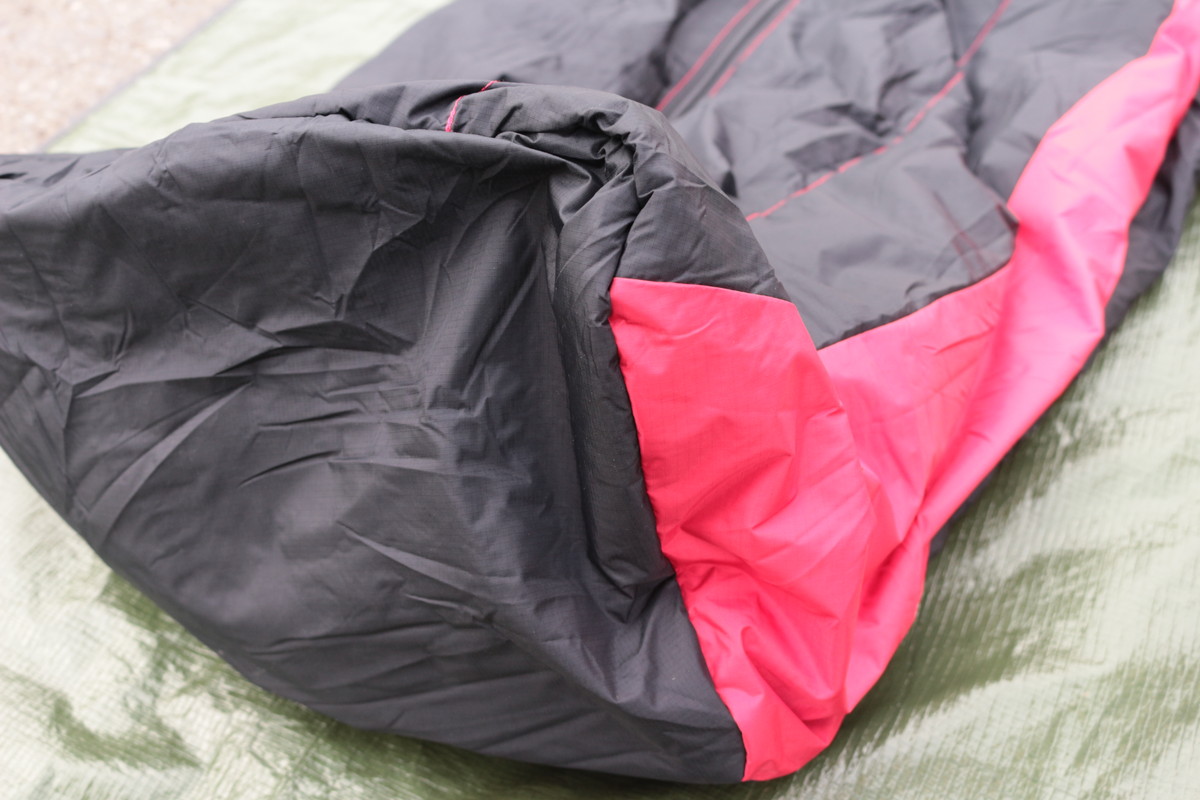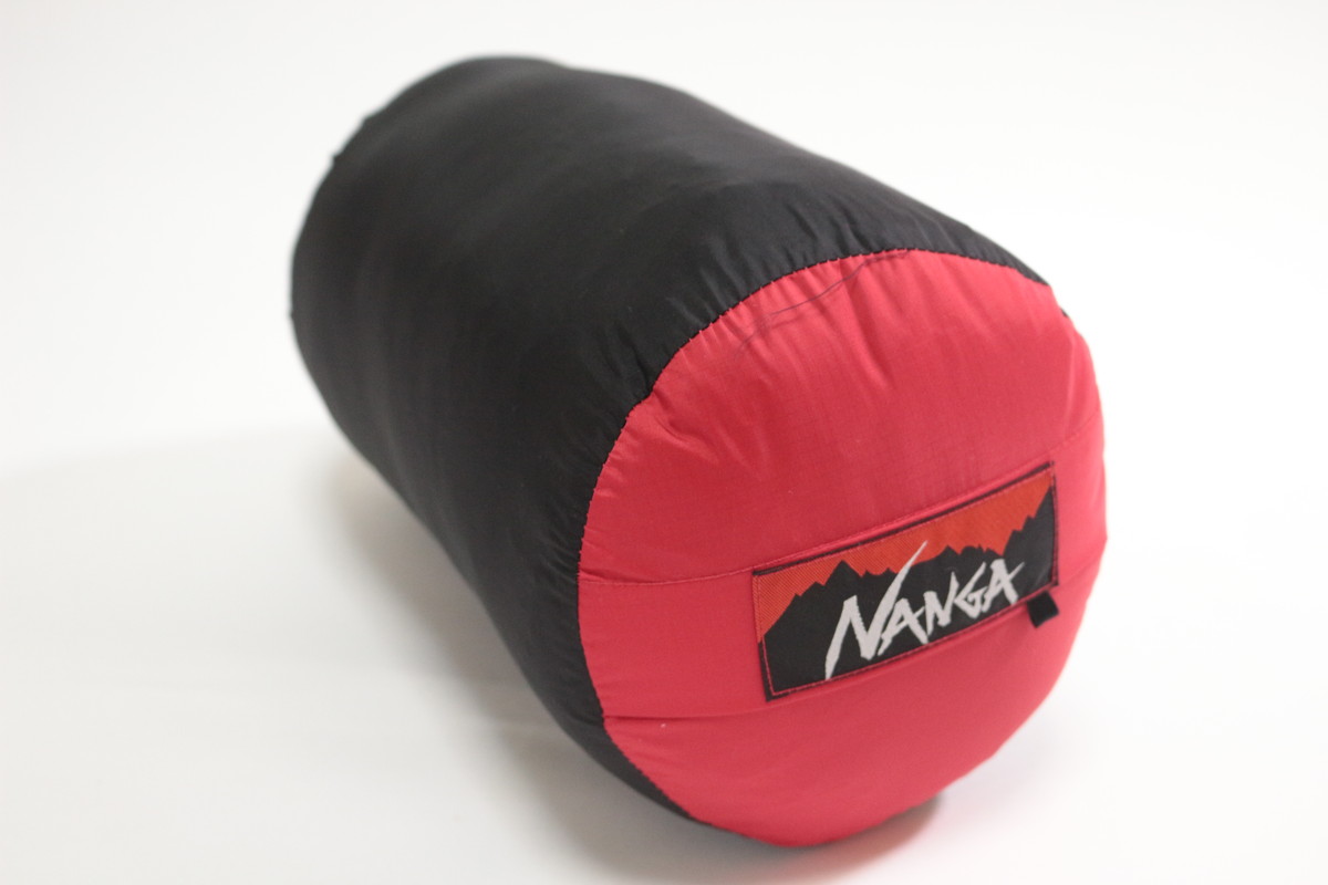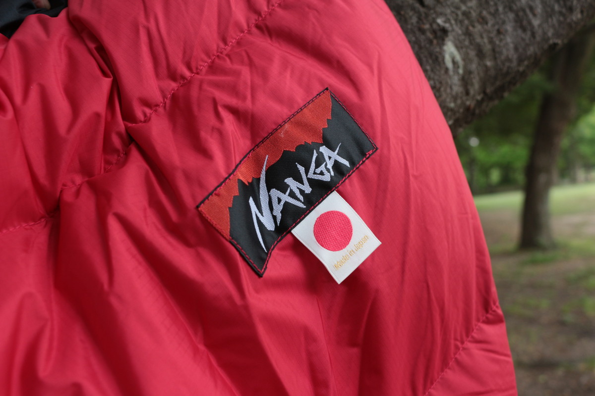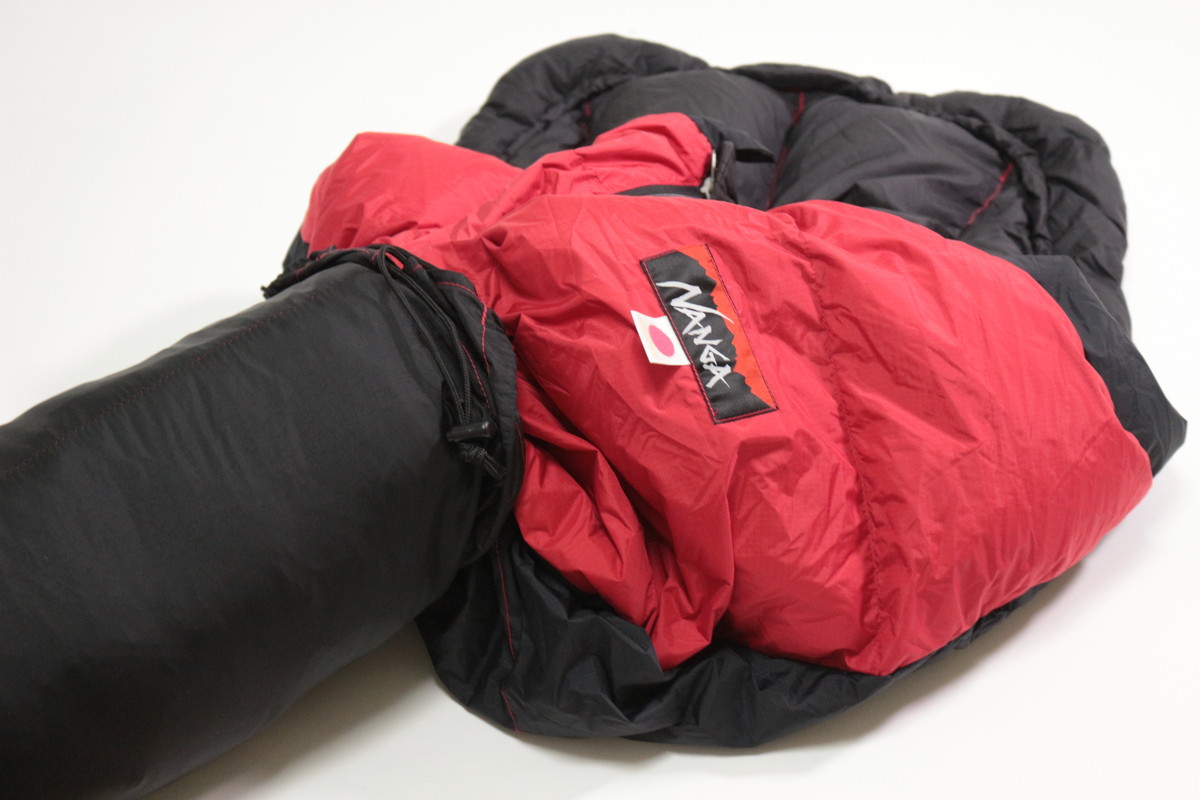 足下は窮屈にならない形状。ちなみに、ナンガの寝袋は細い針穴を使っているそう。そこに太めの縫い糸を使うことで縫い目が密閉され、ダウンが飛び出しにくくなっています。