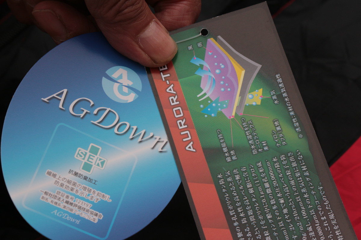 ダウンをくるむ生地は、表地=オーロラテックス、裏地=ナイロンタフタ。オーロラテックスとは、多孔質ポリウレタン防水コーティングを施したナンガ独自の素材で、耐水圧20,000mm、透湿性6,000g/m2/24hrs。つまり、雨や雪は表地が弾き、汗など体から出る水蒸気は裏地のナイロンタフタから表地までスルーします。だから濡れずに蒸れないんです。