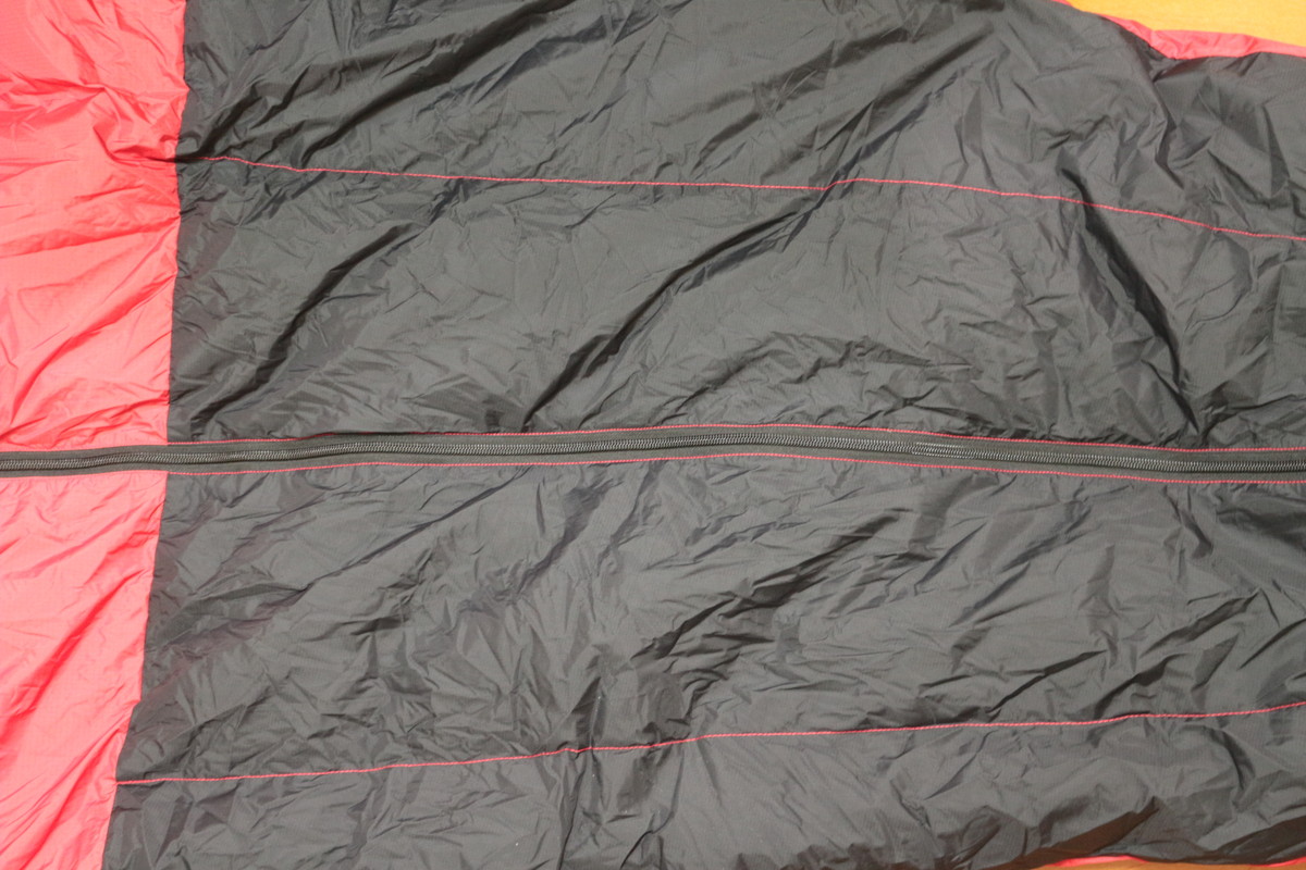 縫い目部分は仕切り(バッフル)となり、封入したダウンが偏らないようにしています。旧モデルはすべて、胸に対して横方向に縫い目が伸びていましたが、現行モデルは背中や足下が縦バッフル。寝返りを打つたびに中綿が端に移動することを防いでくれます。また、縦バッフルにすれば、ほんのわずかですが伸縮性を持たせられます。一方、胸元は横向きバッフルのままに。ダウンの入っている部屋が狭くなるので、ダウンの均一化に役立っています。