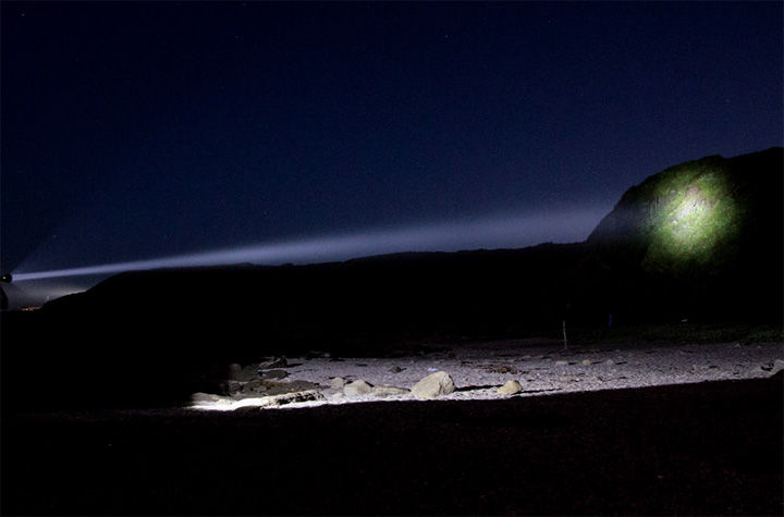 結構ISO感度が高そうな写真ですが、あながち嘘でもない照射画像だと思います。なぜなら、この手の大きなリフを搭載したライトは、中華系のメーカーには以前からありました。そういったモデルを屋外で照射したことは何度もあります。そこで目にした1km超えのモデルはいずれも素晴らしい照射でした。実際に1km先を照らせるかは分かりませんが、「飛んでる様」は同じ1000ルーメンクラスの小型ライトとは段違いの物です。