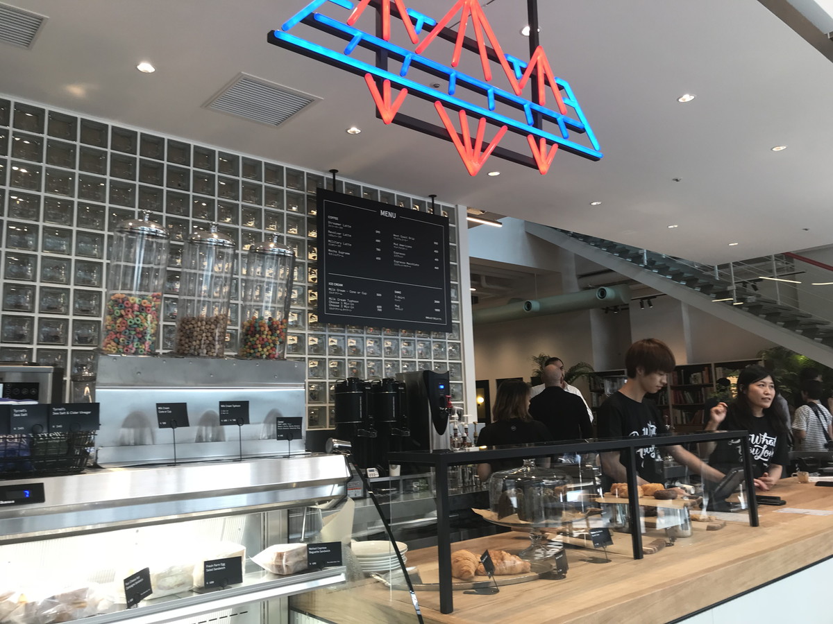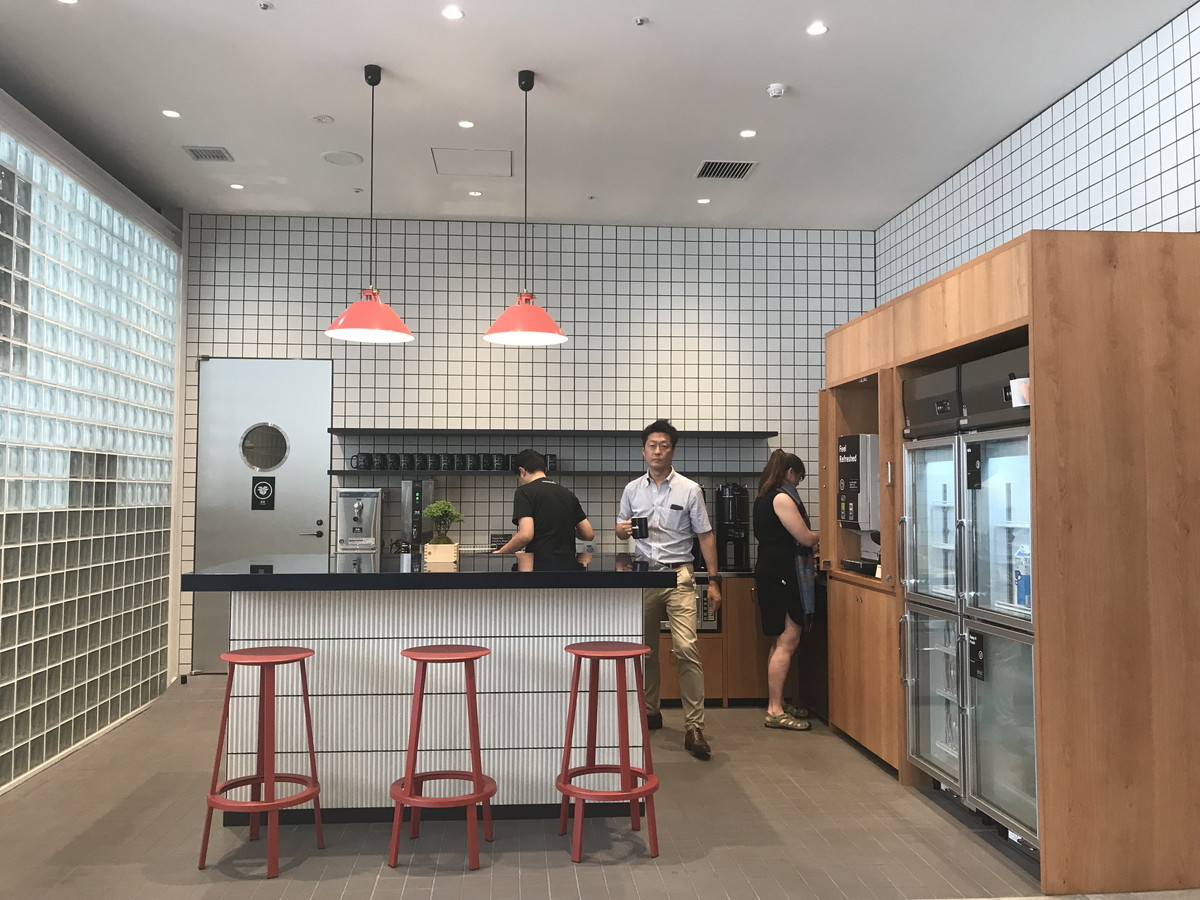 グローバルでも初めての試みとして導入されたのが、WeWorkメンバーではない人でも利用できる併設のカフェ。コーヒーはSTREAMER COFFEE COMPANYのものを提供し、限定メニューのソフトクリーム「Milk Cream Typhoon」や濃厚な抹茶ラテ「Military Latte」などを販売しています。