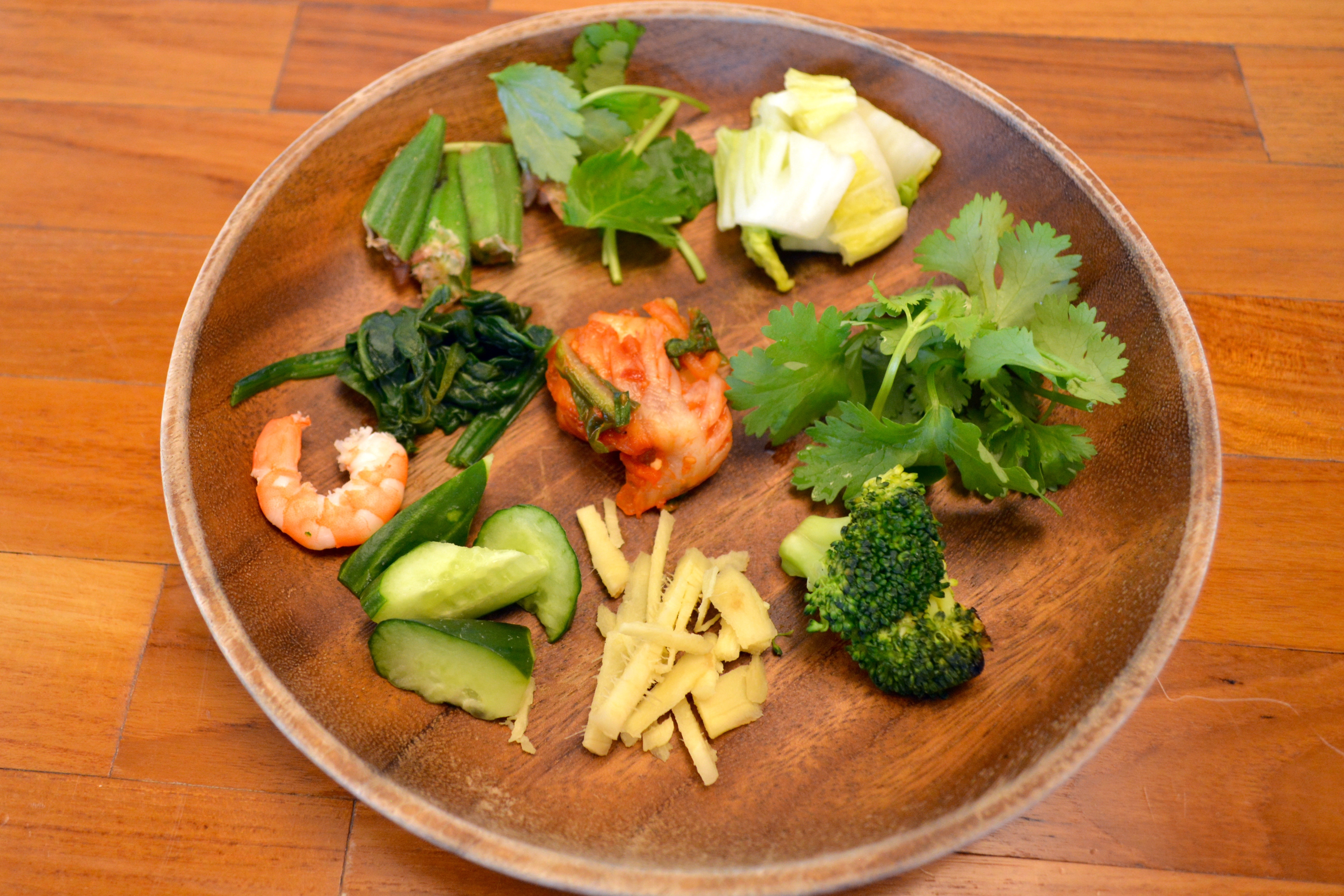 他に、混ぜる具材はエビ/パクチー/キムチ/キュウリ/しょうが/白菜/ほうれん草/オクラ /三つ葉/焦がしブロッコリーの10種類から選べます。